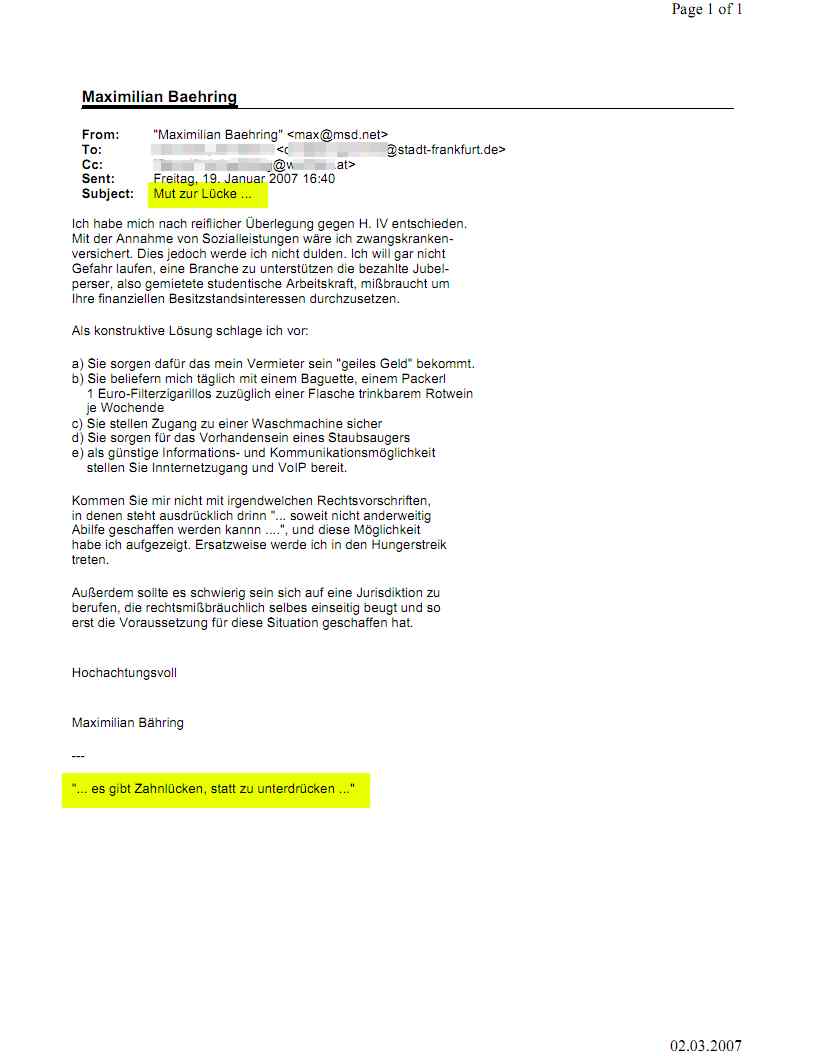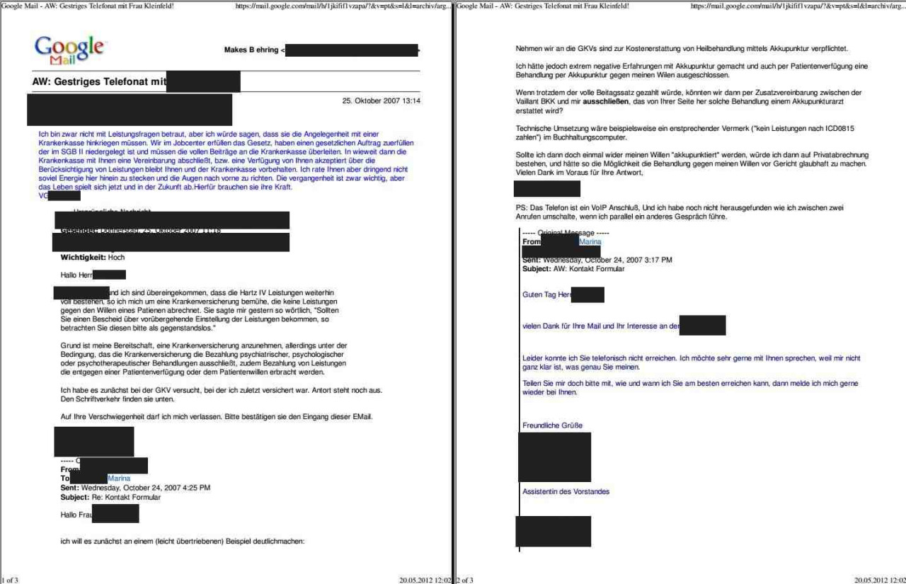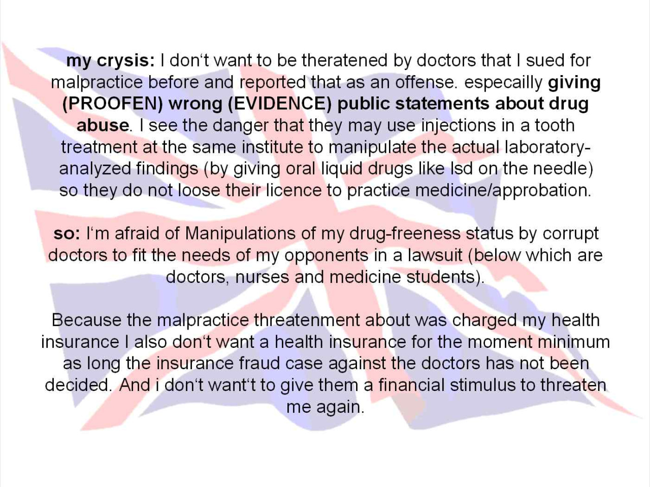 Ich will keine Zahnbehandlung weil ich dafür eine Krankenversicherung abschließen müßte die es wiederum erleichtern würde mich anderweitig gegen meinen Willen zu behandeln. ich bin ABSICHTLICH und zur Abwehr einer nachvllzeihbaren KONKRETEN BEDROHUNG/GEFAHR (psychiatrische Willkürinhaftierung der Deiffamierungen meienr Ex wegen) aus meienr privaten Krankenversicherung ausgestiegen (Selbst-bedienungsladen für Haus-Ärzte irgendwelcher anderer Leute, aber nicht meine (von Klitzing), und deren konsiliarisch hinzugezogene Studienkollegen satt unabhängiger Meinung und vertrauensvollem Arzt/Patientenverhältnis).