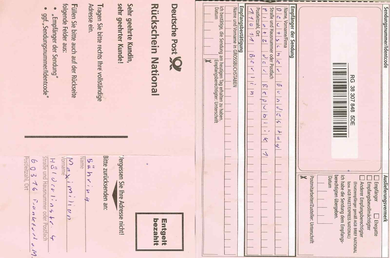 27.12.2013 12:16 https://www.deutschepost.de/sendung/simpleQuery.html Sendungnummer: RG383078485DE [0] "201312271216-71301238150-0.jpg" [1] "201312271216-71301238150-1.jpg" |