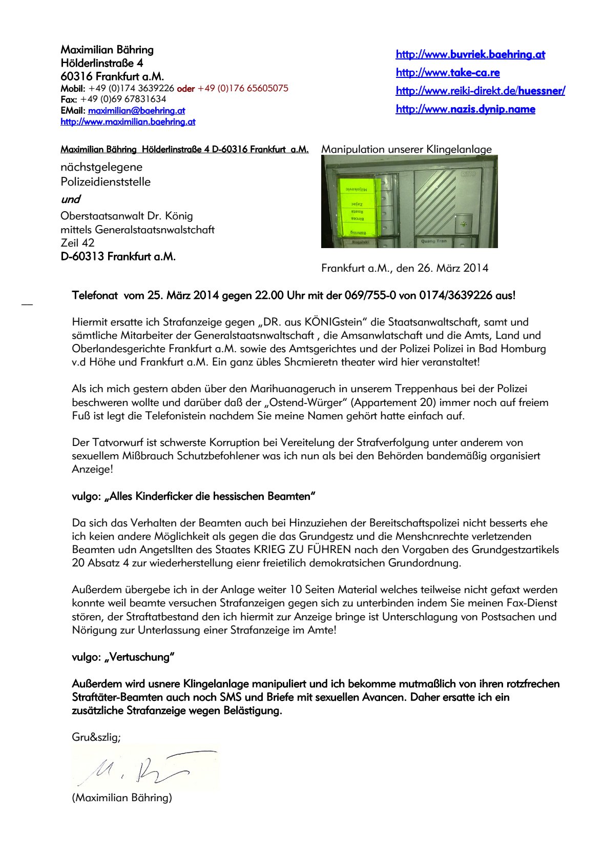 Außerdem wird usnere Klingelanlage manipuliert und ich bekomme mutmaßlich von ihren rotzfrechen Straftäter-Beamten auch noch SMS und Briefe mit sexuellen Avancen. Daher ersatte ich ein zusätzliche Strafanzeige wegen Belästigung.