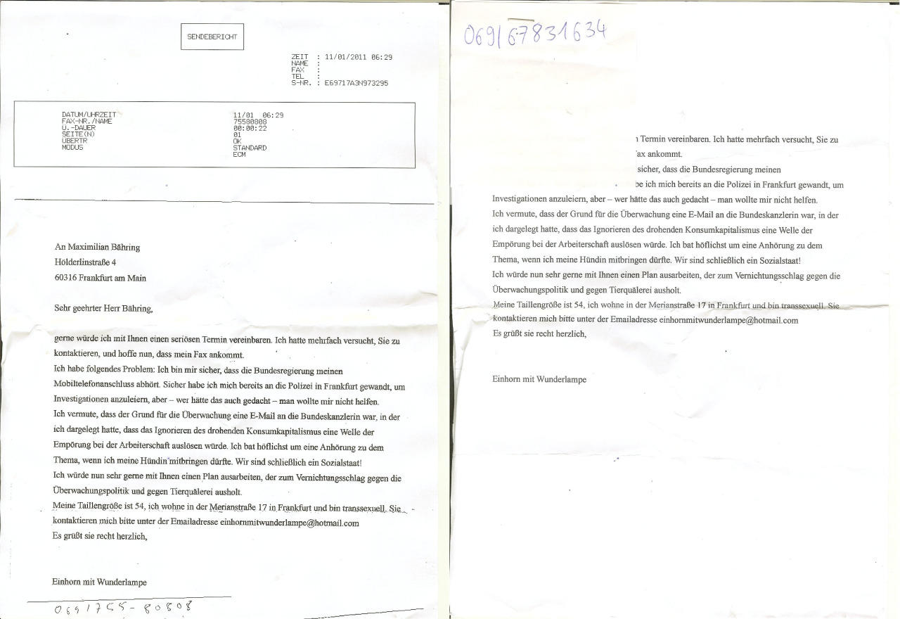 Außerdem übergebe ich in der Anlage weiter 10 Seiten Material welches teilweise nicht gefaxt werden konnte weil beamte versuchen Strafanzeigen gegen sich zu unterbinden indem Sie meinen Fax-Dienst stören, der Straftatbestand den ich hiermit zur Anzeige bringe ist Unterschlagung von Postsachen und Nörigung zur Unterlassung einer Strafanzeige im Amte!