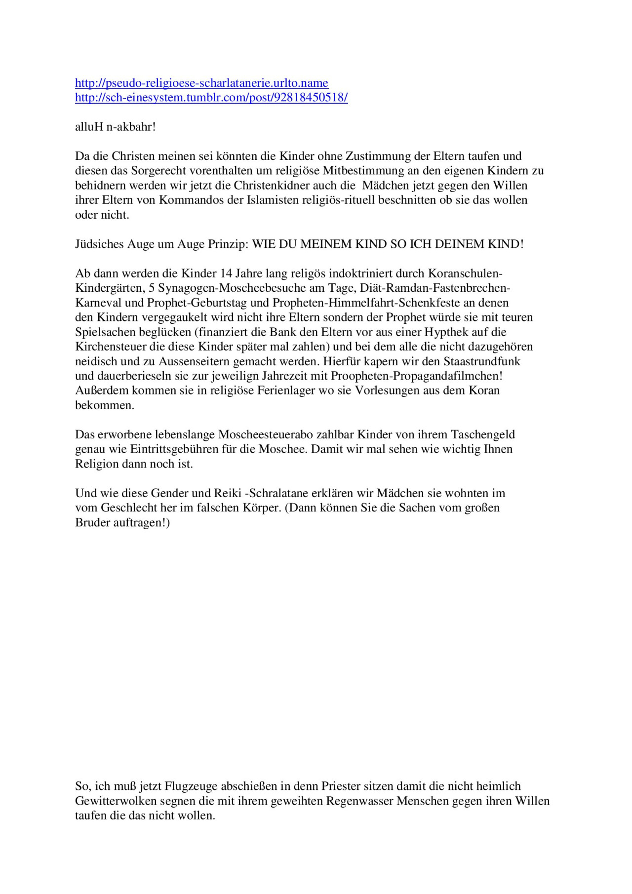 25.07.2014 11:17 http://pseudo-religioese-scharlatanerie.urlto.name alluH n-akbahr! Da die Christen meinen sei könnten die Kinder ohne Zustimmung der Eltern taufen und diesen das Sorgerecht vorenthalten um religiöse Mitbestimmung an den eigenen Kindern zu behidnern werden wir jetzt die Christenkidner auch die Mädchen jetzt gegen den Willen Jüdsiches Auge um Auge Prinzip: WIE DU MEINEM KIND SO ICH DEINEM KIND! Ab dann werden die Kinder 14 Jahre lang religös indoktriniert durch Koranschulen-Kindergärten, 5 Synagogen-Moscheebesuche am Tage, Diät-Ramdan-Fastenbrechen-Karneval und Prophet-Geburtstag und Propheten-Himmelfahrt-Schenkfeste an denen Das erworbene lebenslange Moscheesteuerabo zahlbar Kinder von ihrem Taschengeld