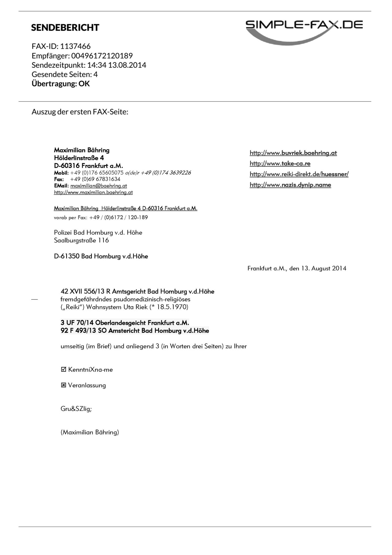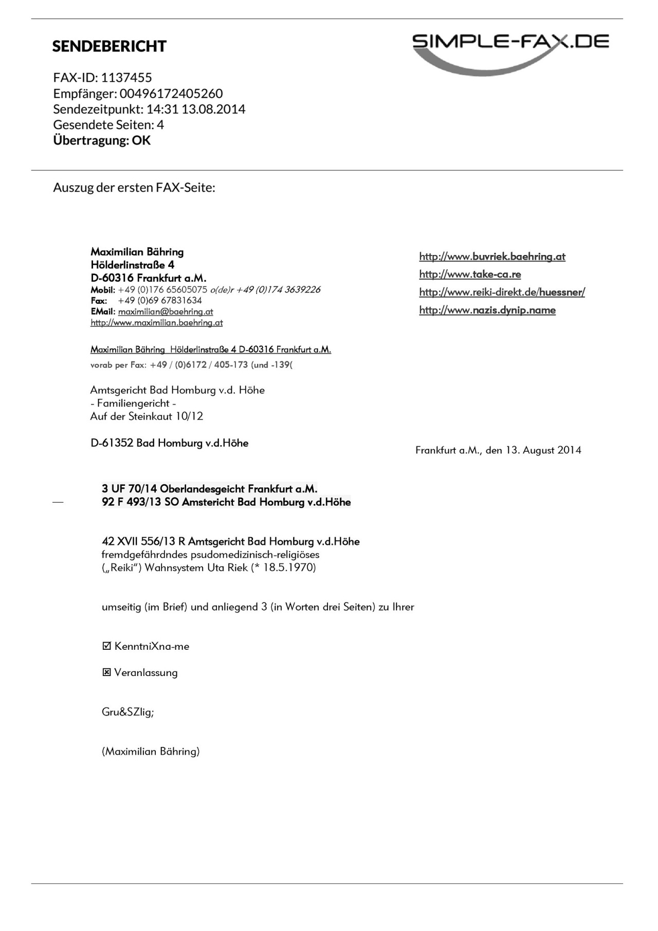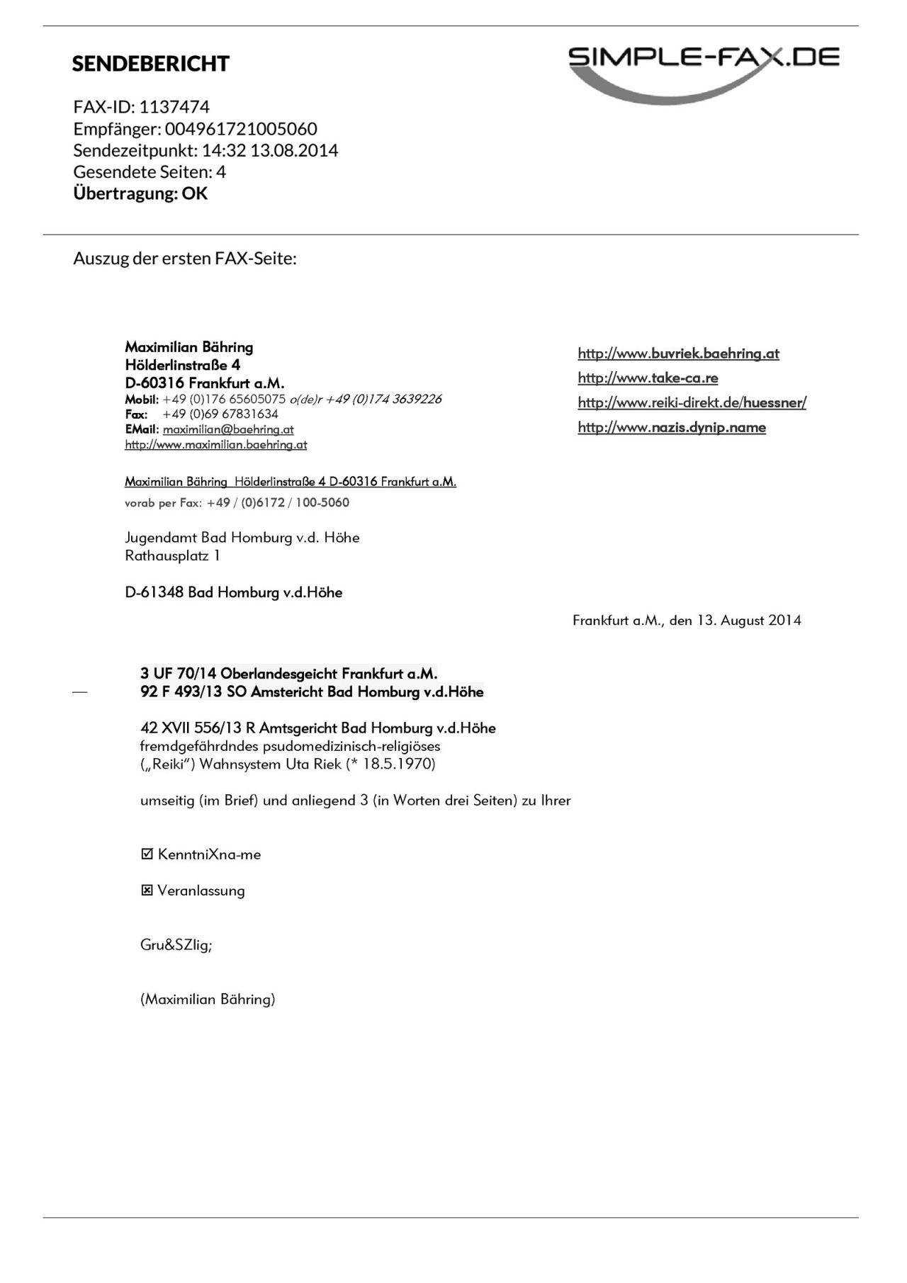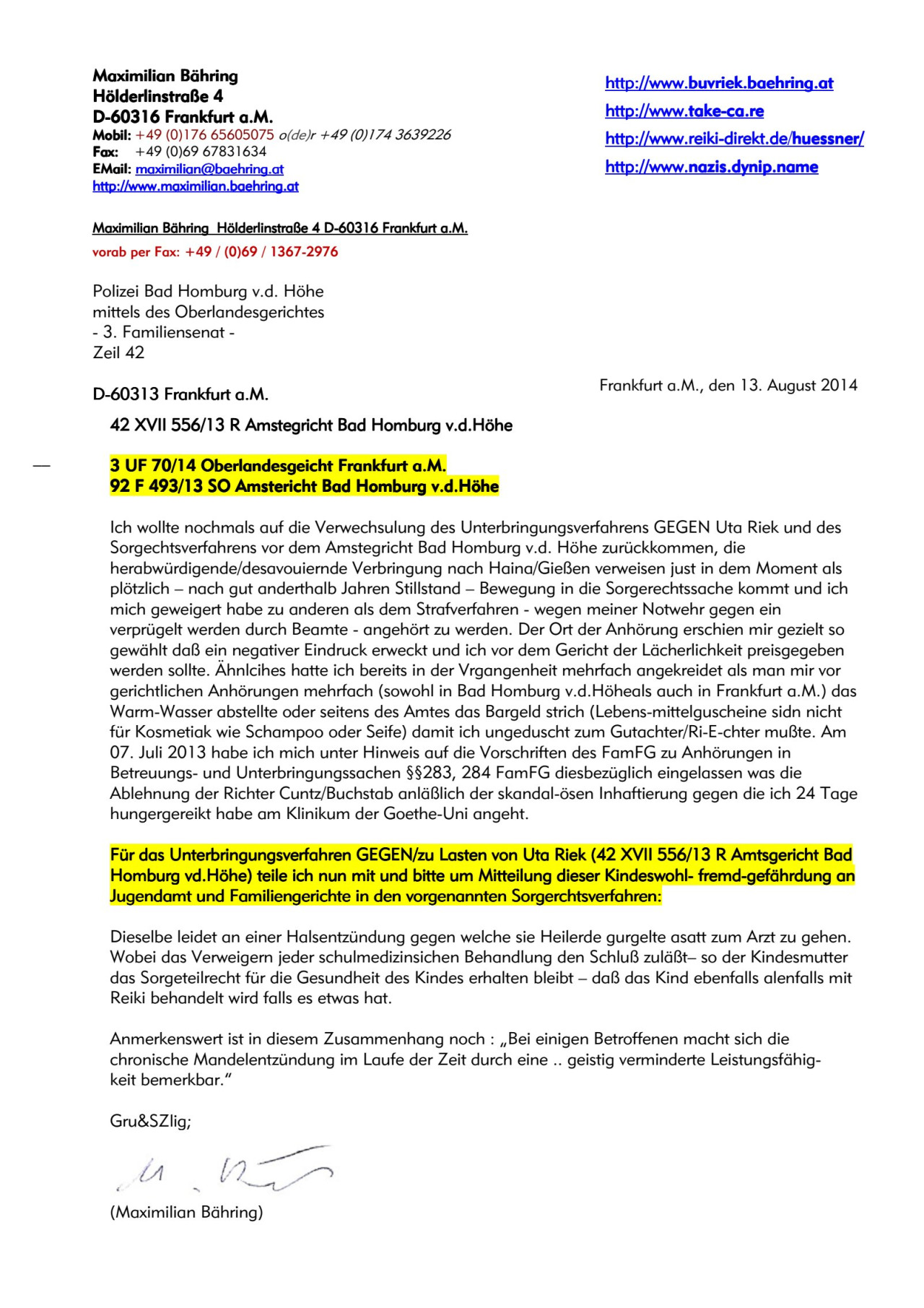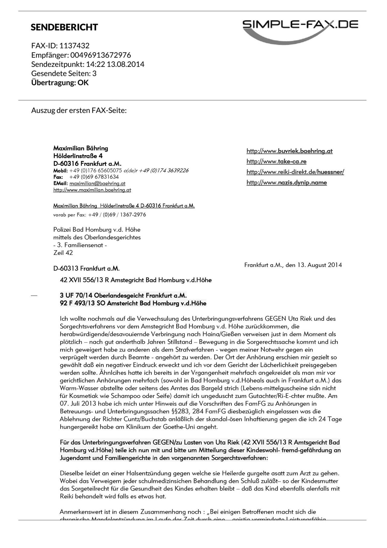 Für das Unterbringungsverfahren GEGEN/zu Lasten von Uta Riek (42 XVII 556/13 R Amtsgericht Bad Homburg vd.Höhe) teile ich nun mit und bitte um Mitteilung dieser Kindeswohl- fremd-gefährdung an Jugendamt und Familiengerichte in den vorgenannten Sorgerchtsverfahren: