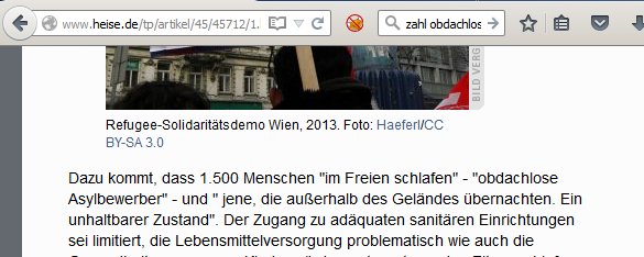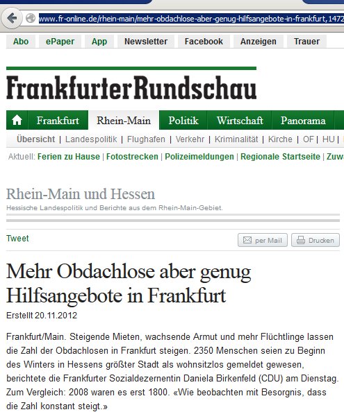 15.08.2015 12:09 http://www.heise.de/tp/artikel/45/45712/1.html "Dazu kommt, dass 1.500 Menschen Im Erstaufnahmelagre Traisberg in Österreich ?im Freien schlafen? - ?obdachlose Asylbewerber? zum Vergleich: In Frankfurt a.M. leben 2.350 Meschen ohne Dach über dem Kopf ASYLBEWEREBR HIN ODER HER http://www.fr-online.de/rhein-main/mehr-obdachlose-aber-genug-hilfsangebote-in-frankfurt,1472796,20918848.html [0] "201508151209-126742698533-0.jpg" [1] "201508151209-126742698533-1.jpg" |
