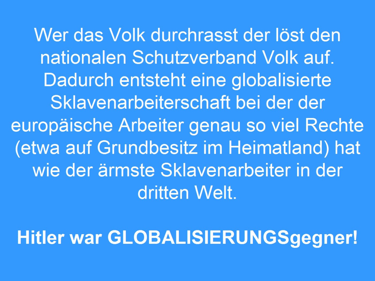 28.08.2015 10:48 Wer das Volk durchrasst der löst den nationalen Schutzverband Volk auf. Dadurch entsteht eine globalisierte Sklavenarbeiterschaft bei der dereuropäische Arbeiter genau so viel Rechte (etwa auf Grundbesitz im Heimatland) hat wie der ärmste Sklavenarbeiter in der dritten Welt. Hitler war GLOBALISIERUNGSgegner! [0] "201508281048-127818962203-0.jpg" [1] "201508281048-127818962203-1.jpg" [2] "201508281048-127818962203-2.jpg" [3] "201508281048-127818962203-3.jpg" [4] "201508281048-127818962203-4.jpg" |