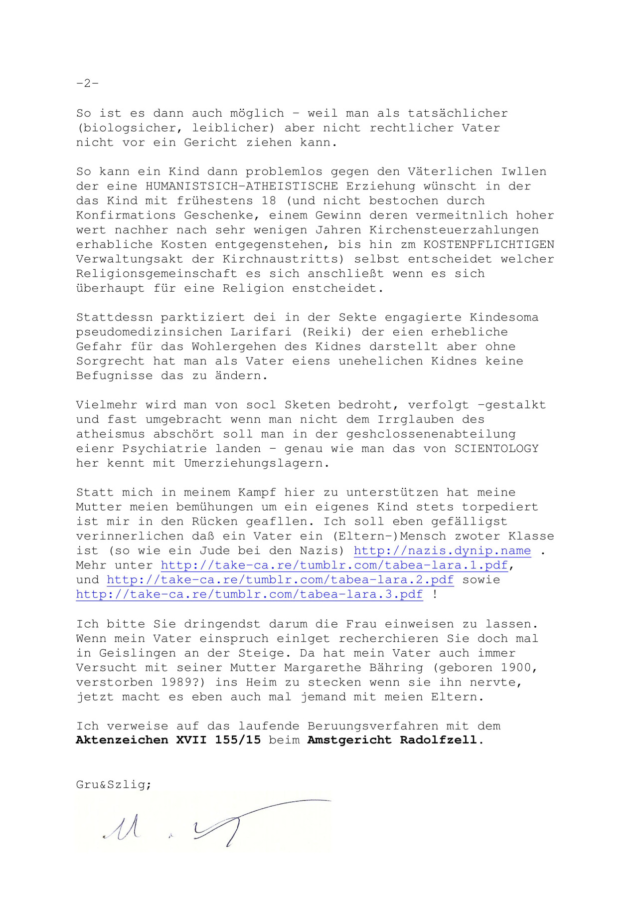 Bernd Bähring und Ilse-Marie Bähring, Im Mösele 17, 78343 Gaienhofen Dauerhafte Unterbringung meiner Eltern in einer psychiatrischen Klinik Aktenzeichen XVII 155/15 Amstgericht Radolfzell Meine (angebliche) Mutter (, denn möglicherweise handelt es sich auch um eine irre Stalkerin die vorgbit meien Mutter zu sein) belästigt mich erneut und wiederholt mit Telefonaten. (es kann ich natürlich auch um jemanden aus der Sekte in der meine Ex,die Mutter meienr Tochter engagiert ist, handeln der nur vorgibt meine Mutter zu sein - siehe http://take-ca.re und http://reiki-direkt.de/huessner/, http://reiki-direkt.de). Zuletzt erfolgte soch Anruf am 26. November 2015 um 10:34 Uhr. Während ich als leiblicher Vater im leben meines ? wichtig: -MINDERJÄHRIGEN Kind vollkomemn egal sein soll ? sozusagen ein gegen seien Willen zum Samenspender sexuell missbrauchter ? soll sie als Mutter wichtig sein wenn ich schon längst erwachsen bin und nicht mehr im elterlichen Haushalt lebe ? nur weil sie ? siehe das christliche Märchen von der jungfräu-lichen Empfängnis ? eien Frau ist. Weil man - aufgrund Sketenzugehörigkeit keine Anästhesisten an sich heranlässt sondern nur Wunderheiler - Geburtsschmerzen hatte macht einen das zum besseren Elternteil. In ihrer Irren Weltanschuung sind Kinder nicht das Ergebnis von Beischlaf sondern kommen ohne väterliches zutun zustande sie ?gehören? Gott was dann erklärt dass die Kirche eien florierendes Geshcäft mit Adoptionen (vornehmlich Ärmerer aus der dritten Welt) betreiben kann weil die biologische Realität mit dem Eintrag der Abstammung im Stammbuch nichts zu tun hat. ?/-2- -2- So ist es dann auch möglich ? weil man als tatsächlicher (biologsicher, leiblicher) aber nicht rechtlicher Vater nicht vor ein Gericht ziehen kann.