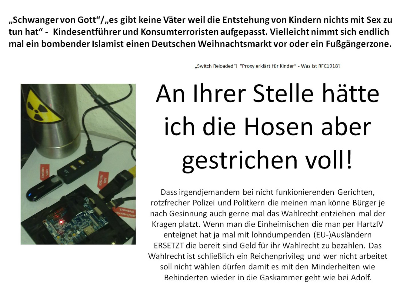 ?Switch Reloaded?! ?Proxy erklärt für Kinder? - Was ist RFC1918?An Ihrer Stelle hätte ich die Hosen aber gestrichen voll!Dass irgendjemandem bei nicht funkionierenden Gerichten, rotzfrecher Polizei und Politkern die meinen man könne Bürger je nach Gesinnung auch gerne mal das Wahlrecht entziehen mal der Kragen platzt. Wenn man die Einheimischen die man per HartzIV enteignet hat ja mal mit lohndumpenden (EU-)Ausländern ERSETZT die bereit sind Geld für ihr Wahlrecht zu bezahlen. Das Wahlrecht ist schließlich ein Reichenprivileg und wer nicht arbeitet soll nicht wählen dürfen damit es mit den Minderheiten wie Behinderten wieder in die Gaskammer geht wie bei Adolf.