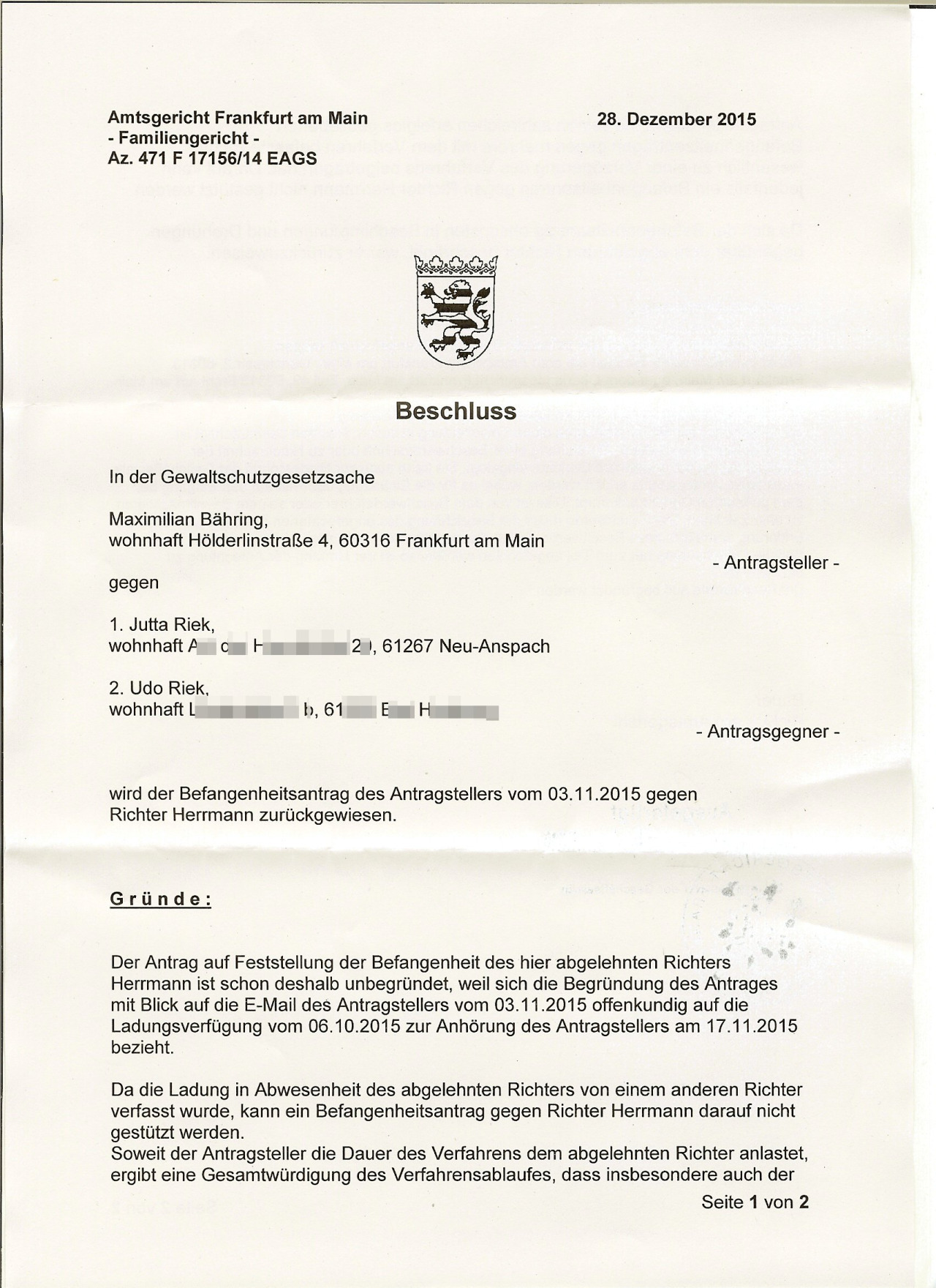 im Briefkasten Ablehnungsbeschluss meines Befangenheitsantrags.~~~Am 08. Januar komme ich nun dazu dieses begonen Shcriebn fortzusetzen und Ihnen folgendes GENÖTIGTERWEISE bereits