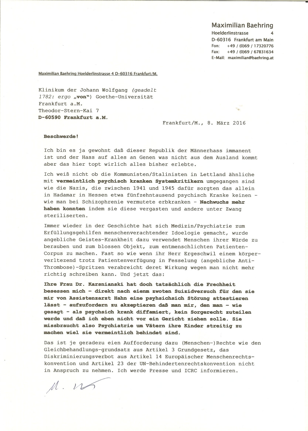 08.03.2016 08:47 Bomben auf Krankenhäuser Wie Sie vielleicht wissen korrespondiere ich als Deutscher Widerstand nachweislich mit diplomatischen Vertretern jener Staaten mit denen sich Merkel-Deutschland im Streit befindet, etwa Nord-Korea, Pakistan oder Afghanistan! Meine Schilderungen der massiven und eklatanten Menschrechtseverletzungen durch deutsche Medizinier/Psychiater die meinen ein parallelesStraf-Justizsystem auf Basis von psychiatrischen Falschguachetn aufabnuen zu klönenn führen dazu daß man dem ICRC/Roten Kreuz erstmalig seit der Genfer Konvetion von 1864 nicht mehr glaubt im Kriege unparteiisch zu sein. Das ist die Ursache für Bomben-angriffe gegen Krankenhäuser in Syrien und Afghanistan. SIE ? Goethe Uni Klinik - SIND SCHULD! |