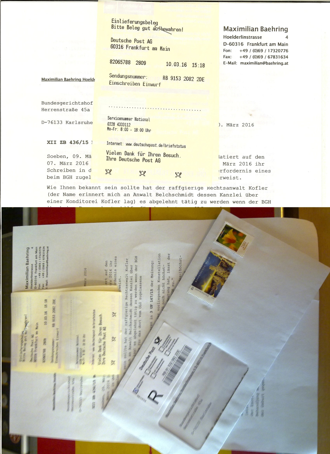 Soeben, 09. März 2013 erhalte ich per normaler Post, datiert auf den 07. März 2016 laut Frankiertsempel aufgegegeben am 08. März 2016 ihr Schreiben in dem ein/e Fräulein/Frau Geszler auf Formerfordernis eines beim BGH zugelassenen Anwaltes für jegliche Eingabe verweist.
