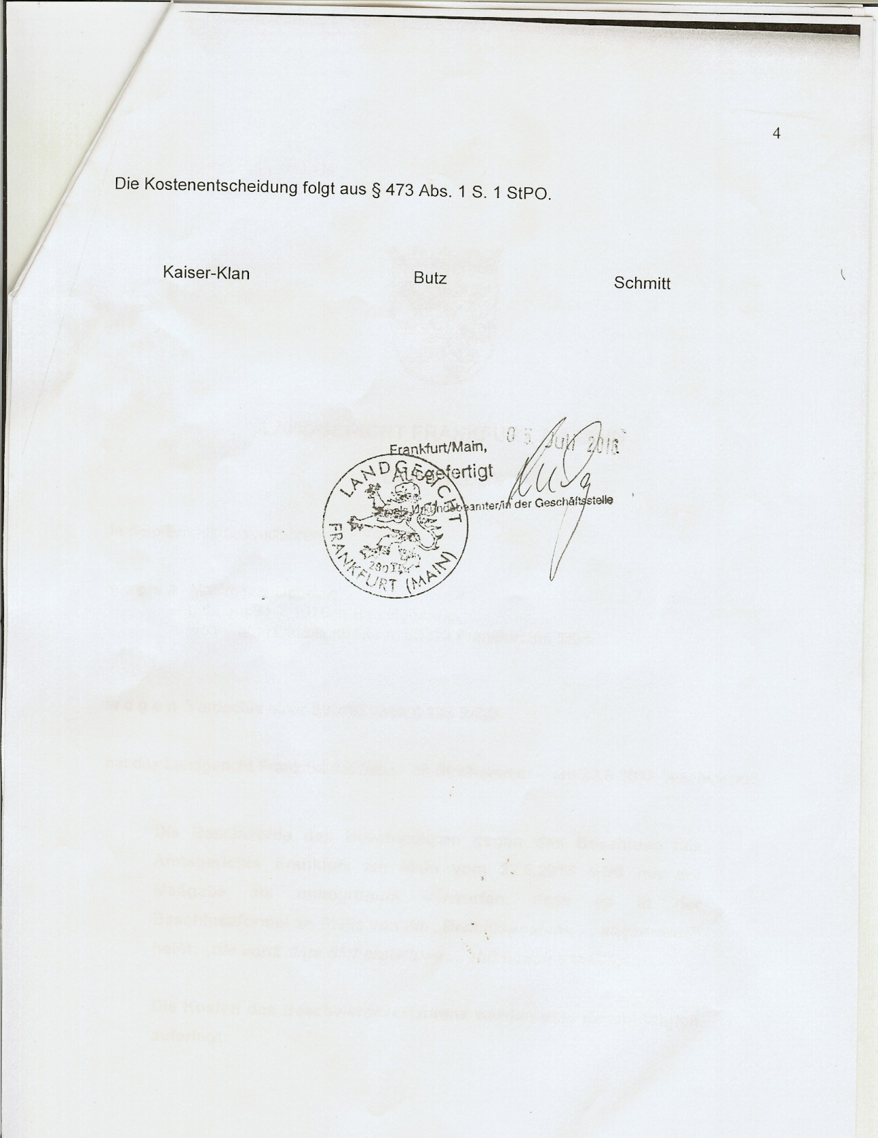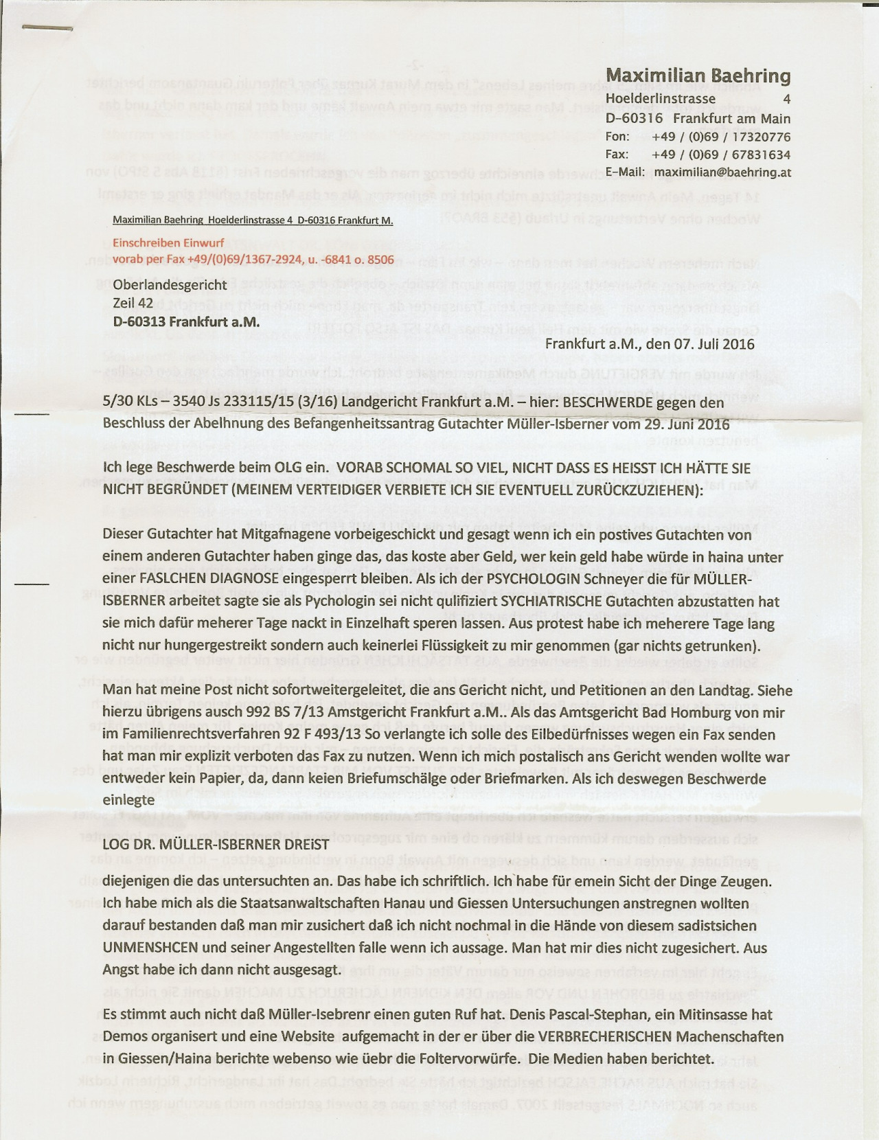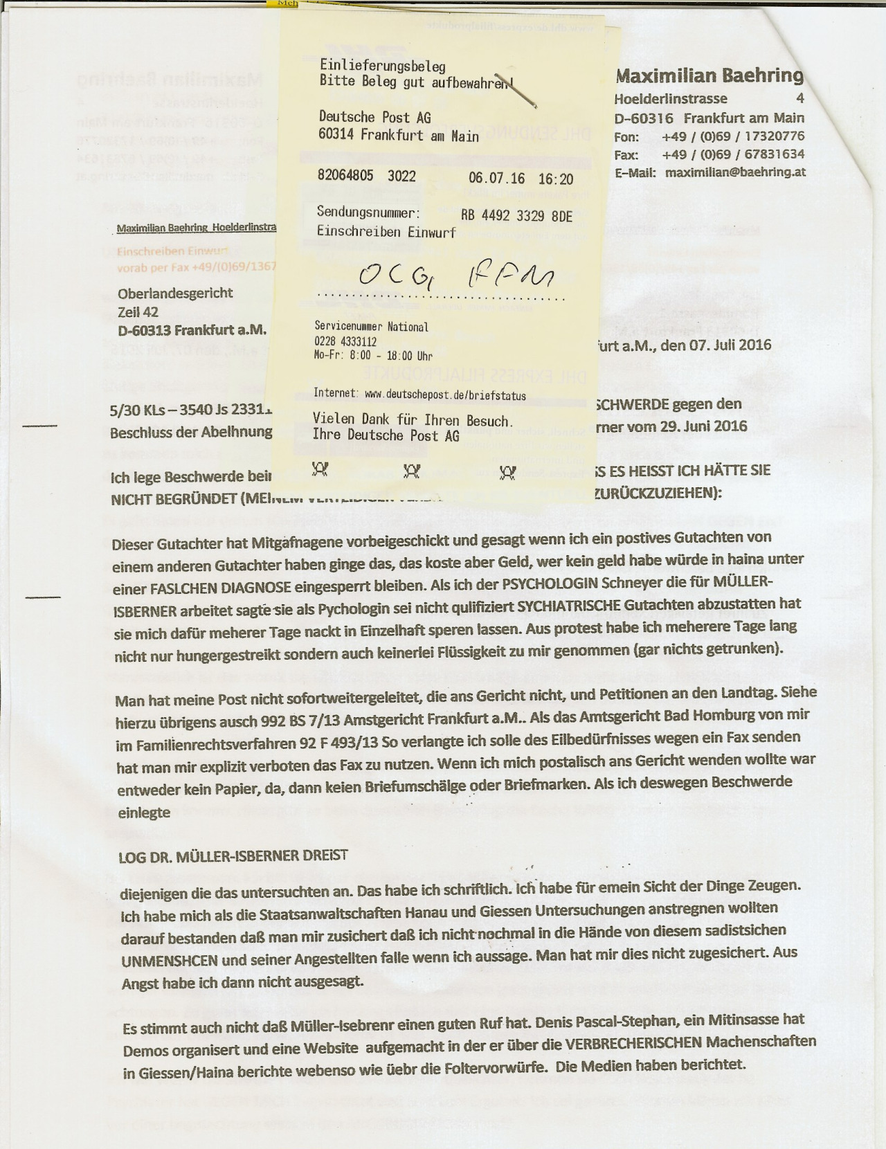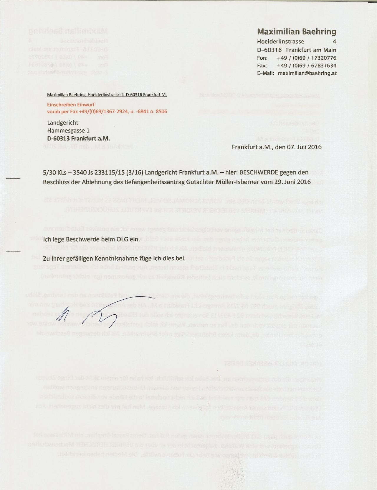 5/30 KLs ? 3540 Js 233115/15 (3/16) Landgericht Frankfurt a.M. ? hier:BESCHWERDE gegen denBeschluss der Ablehnung des Befangenheitssantrag GutachterMüller-Isberner vom 29. Juni 2016