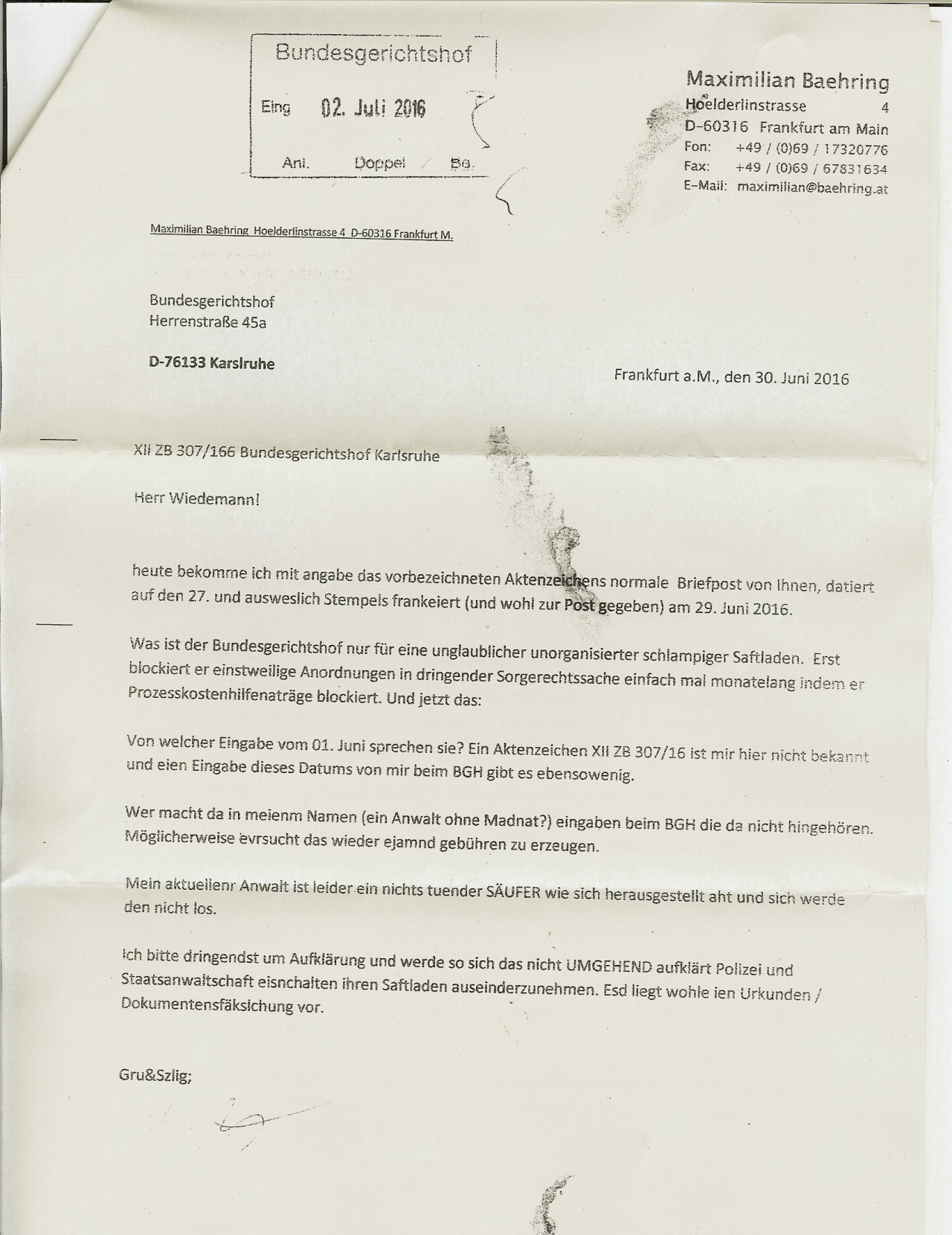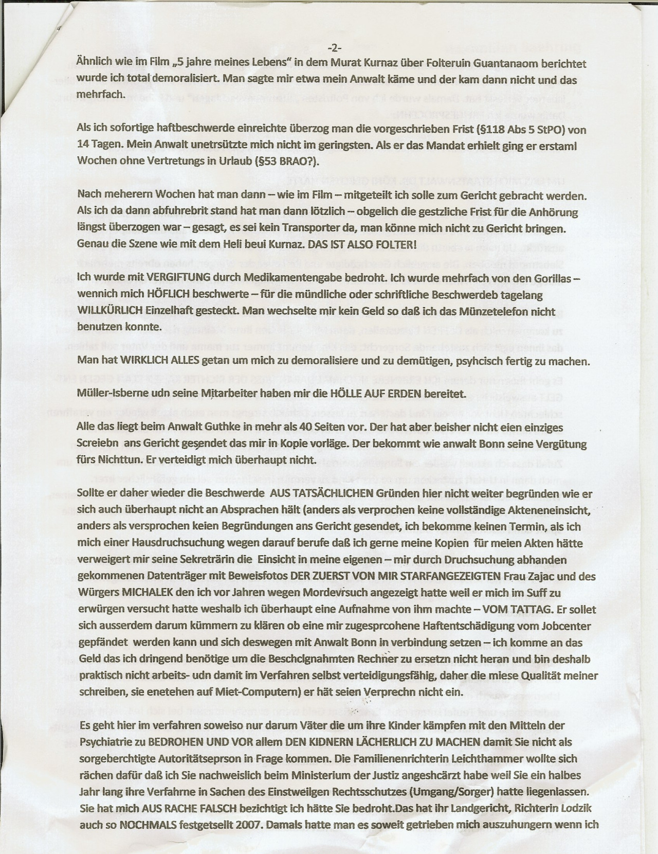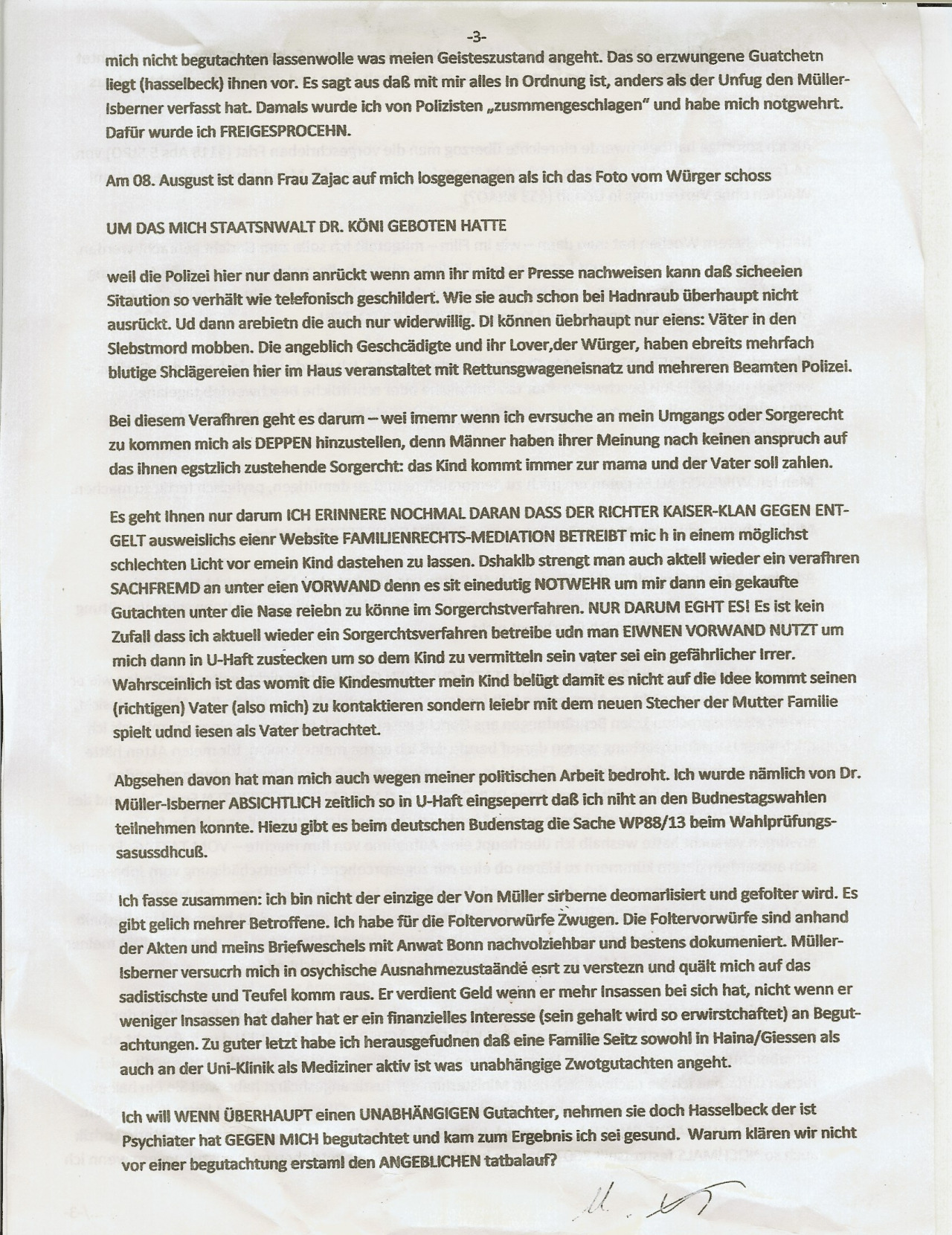 Ich lege Beschwerde beim OLG ein. VORAB SCHOMAL SO VIEL, NICHT DASS ES HEISST ICH HÄTTE SIE NICHT BEGRÜNDET (MEINEM VERTEIDIGER VERBIETE ICH SIE EVENTUELL ZURÜCKZUZIEHEN): Dieser Gutachter hat Mitgafnagene vorbeigeschickt und gesagt wenn ich ein postives Gutachten von einem anderen Gutachter haben ginge das, das koste aber Geld, wer kein geld habe würde in haina unter einer FASLCHEN DIAGNOSE eingesperrt bleiben. Als ich der PSYCHOLOGIN Schneyer die für MÜLLER-ISBERNER arbeitet sagte sie als Pychologin sei nicht qulifiziertSYCHIATRISCHE Gutachten abzustatten hat sie mich dafür meherer Tage nackt in Einzelhaft speren lassen. Aus protest habe ich meherere Tage lang nicht nur hungergestreikt sondern auch keinerlei Flüssigkeit zu mir genommen (gar nichts getrunken). Man hat meine Post nicht sofortweitergeleitet, die ans Gericht nicht,und Petitionen an den Landtag. Siehe hierzu übrigens ausch 992 BS 7/13 Amstgericht Frankfurt a.M.. Als das Amtsgericht Bad Homburg von mir im Familienrechtsverfahren 92 F 493/13 So verlangte ich solle des Eilbedürfnisses wegen ein Fax senden hat man mir explizit verboten das Fax zu nutzen. Wenn ich mich postalisch ans Gericht wenden wollte war entweder kein Papier, da, dann keien Briefumschälge oder Briefmarken. Als ich deswegen Beschwerde einlegte LOG DR. MÜLLER-ISBERNER DREiST diejenigen die das untersuchten an. Das habe ich schriftlich. Ich habefür emein Sicht der Dinge Zeugen. Ich habe mich als die Staatsanwaltschaften Hanau und GiessenUntersuchungen anstregnen wollten darauf bestanden daß man mir zusichert daß ich nicht nochmal in die Hände von diesem sadistsichen UNMENSHCEN und seiner Angestellten falle wenn ich aussage. Man hat mir dies nicht zugesichert. Aus Angst habe ich dann nicht ausgesagt. Es stimmt auch nicht daß Müller-Isebrenr einen guten Ruf hat. DenisPascal-Stephan, ein Mitinsasse hat Demos organisert und eine Website aufgemacht in der er über die VERBRECHERISCHEN Machenschaften in Giessen/Haina berichte webenso wie üebr die Foltervorwürfe. Die Medien haben berichtet. Ähnlich wie im Film ?5 jahre meines Lebens? in dem Murat Kurnaz über Folteruin Guantanaom berichtet wurde ich total demoralisiert. Man sagte mir etwa mein Anwalt käme und der kam dann nicht und das mehrfach. Als ich sofortige haftbeschwerde einreichte überzog man dievorgeschrieben Frist (§118 Abs 5 StPO) von 14 Tagen. Mein Anwaltunetrsützte mich nicht im geringsten. Als er das Mandat erhielt ging er erstaml Wochen ohne Vertretungs in Urlaub (§53 BRAO?). Nach meherern Wochen hat man dann ? wie im Film ? mitgeteilt ich solle zum Gericht gebracht werden. Als ich da dann abfuhrebrit stand hat man dann lötzlich ? obgelich die gestzliche Frist für die Anhörung längst überzogen war ? gesagt, es sei kein Transporter da, man könne mich nicht zu Gericht bringen. Genau die Szene wie mit dem Heli beui Kurnaz. DAS IST ALSO FOLTER! Ich wurde mit VERGIFTUNG durch Medikamentengabe bedroht. Ich wurde mehrfach von den Gorillas ? wennich mich HÖFLICH beschwerte ? für die mündliche oder schriftliche Beschwerdeb tagelang WILLKÜRLICH Einzelhaft gesteckt. Man wechselte mir kein Geld so daß ich das Münzetelefon nicht benutzen konnte. Man hat WIRKLICH ALLES getan um mich zu demoralisiere und zu demütigen, psyhcisch fertig zu machen. Müller-Isberne udn seine Mitarbeiter haben mir die HÖLLE AUF ERDEN bereitet. Alle das liegt beim Anwalt Guthke in mehr als 40 Seiten vor. Der hataber beisher nicht eien einziges Screiebn ans Gericht gesendet das mir in Kopie vorläge. Der bekommt wie anwalt Bonn seine Vergütung fürs Nichttun. Er verteidigt mich überhaupt nicht. Sollte er daher wieder die Beschwerde AUS TATSÄCHLICHEN Gründen hier nicht weiter begründen wie er sich auch überhaupt nicht an Absprachen hält (anders als verprochen keine vollständige Akteneneinsicht, anders als versprochen keien Begründungen ans Gericht gesendet, ich bekomme einen Termin, als ich mich einer Hausdruchsuchung wegen darauf berufe daß ich gerne meine Kopien für meien Akten hätte verweigert mir seine Sekreträrin die Einsicht in meine eigenen ? mir durch Druchsuchungabhanden gekommenen Datenträger mit Beweisfotos DER ZUERST VON MIR STARFANGEZEIGTEN Frau Zajac und des Würgers MICHALEK den ich vor Jahren wegen Mordevrsuch angezeigt hatte weil er mich im Suff zu erwürgen versucht hatte weshalb ich überhaupt eine Aufnahme von ihm machte ? VOM TATTAG. Er sollet sich ausserdem darum kümmern zu klären ob eine mirzugesprcohene Haftentschädigung vom Jobcenter gepfändet werden kann und sich deswegen mit Anwalt Bonn in verbindung setzen ? ich komme an das Geld das ich dringend benötige um die Beschclgnahmten Rechner zu ersetzn nicht heran und bin deshalb praktisch nicht arbeits- udn damit im Verfahren selbst verteidigungsfähig, daher die miese Qualität meinerschreiben, sie enetehen auf Miet-Computern) er hät seien Verprechn nichtein. Es geht hier im verfahren soweiso nur darum Väter die um ihre Kinder kämpfen mit den Mitteln der Psychiatrie zu BEDROHEN UND VOR allem DEN KIDNERN LÄCHERLICH ZU MACHEN damit Sie nicht als sorgeberchtigte Autoritätseprson in Frage kommen. Die Familienenrichterin Leichthammer wollte sich rächen dafür daß ich Sie nachweislich beim Ministerium der Justiz angeshcärzt habe weil Sie ein halbes Jahr lang ihre Verfahrne in Sachen des Einstweilgen Rechtsschutzes (Umgang/Sorger) hatte liegenlassen.Sie hat mich AUS RACHE FALSCH bezichtigt ich hätte Sie bedroht.Das hat ihr Landgericht, Richterin Lodzik auch so NOCHMALS festgetsellt 2007.Damals hatte man es soweit getrieben mich auszuhungern wenn ich mich nicht begutachten lassenwolle was meien Geisteszustand angeht. Das so erzwungene Guatchetn liegt (hasselbeck) ihnen vor. Es sagt aus daß mit mir alles In Ordnung ist, anders als der Unfug den Müller- Isberner verfasst hat. Damals wurde ich von Polizisten ?zusmmengeschlagen? und habe mich notgwehrt.Dafür wurde ich FREIGESPROCEHN. Am 08. Ausgust ist dann Fr
