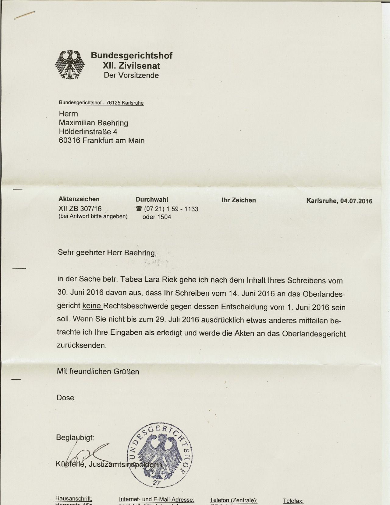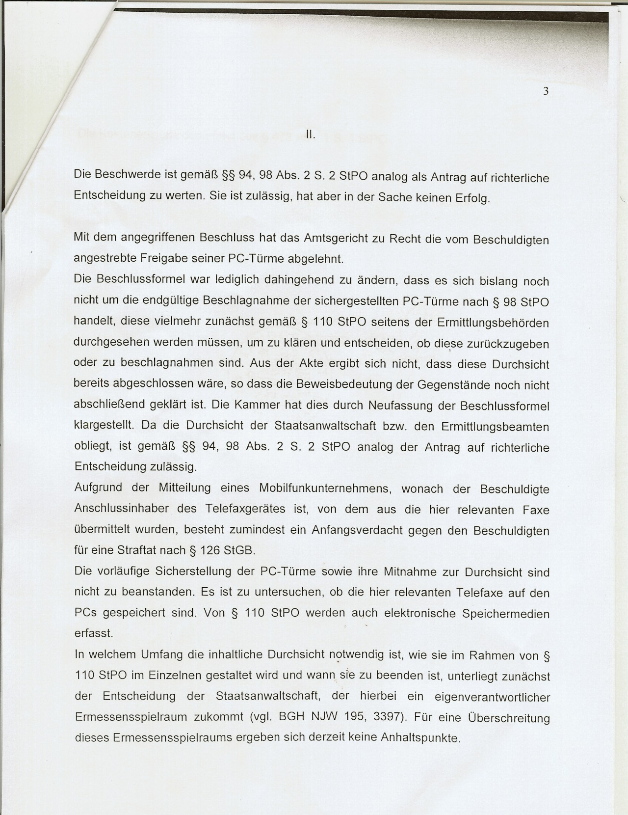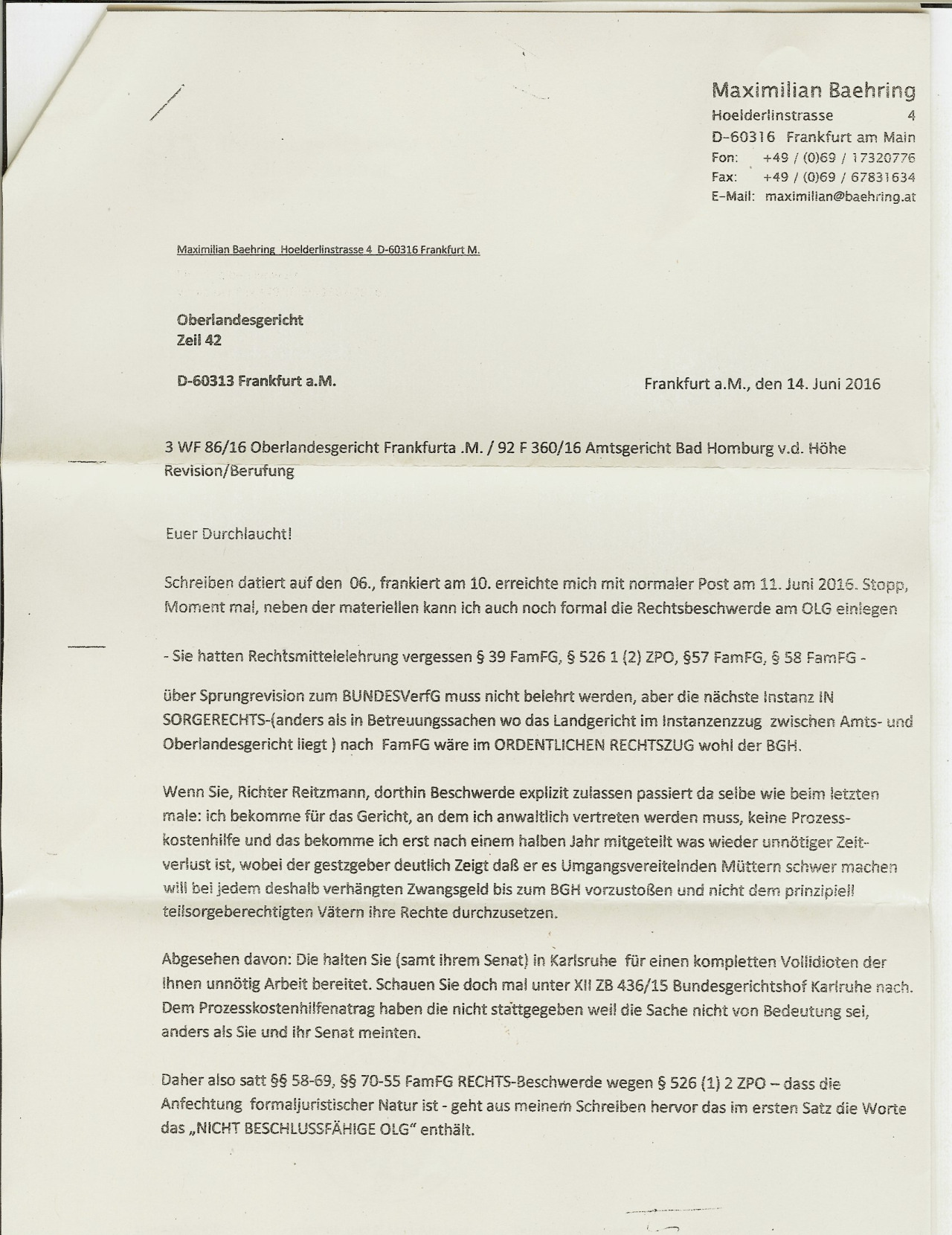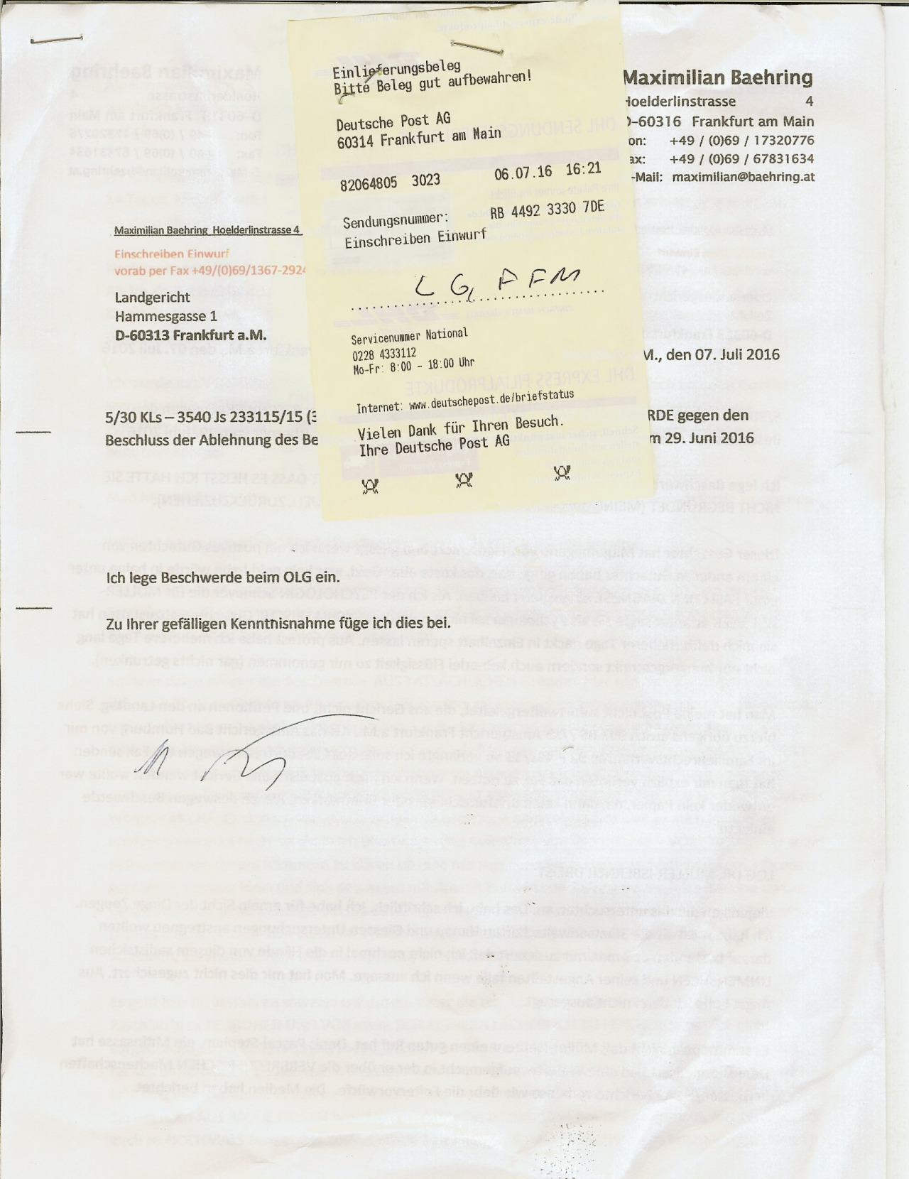 Ich lege Beschwerde beim OLG ein. Zu Ihrer gefälligen Kenntnisnahme füge ich dies bei.