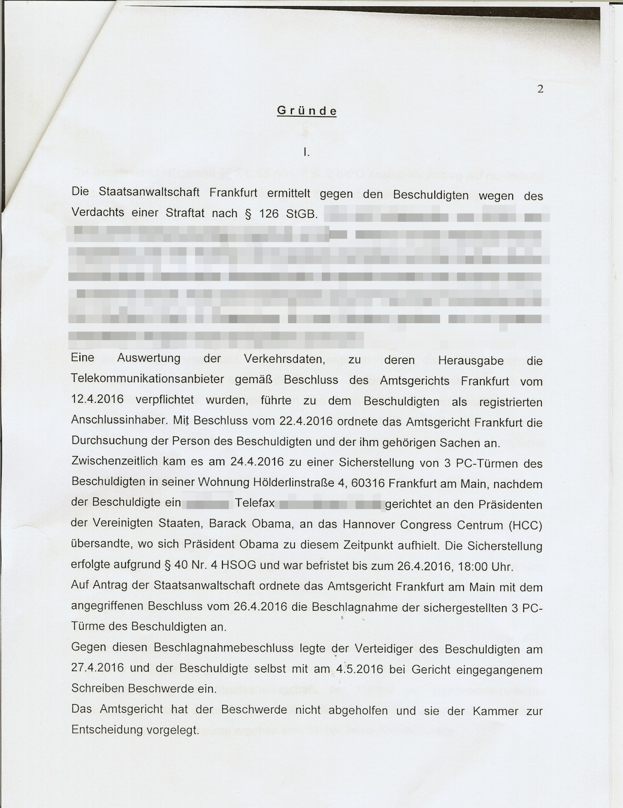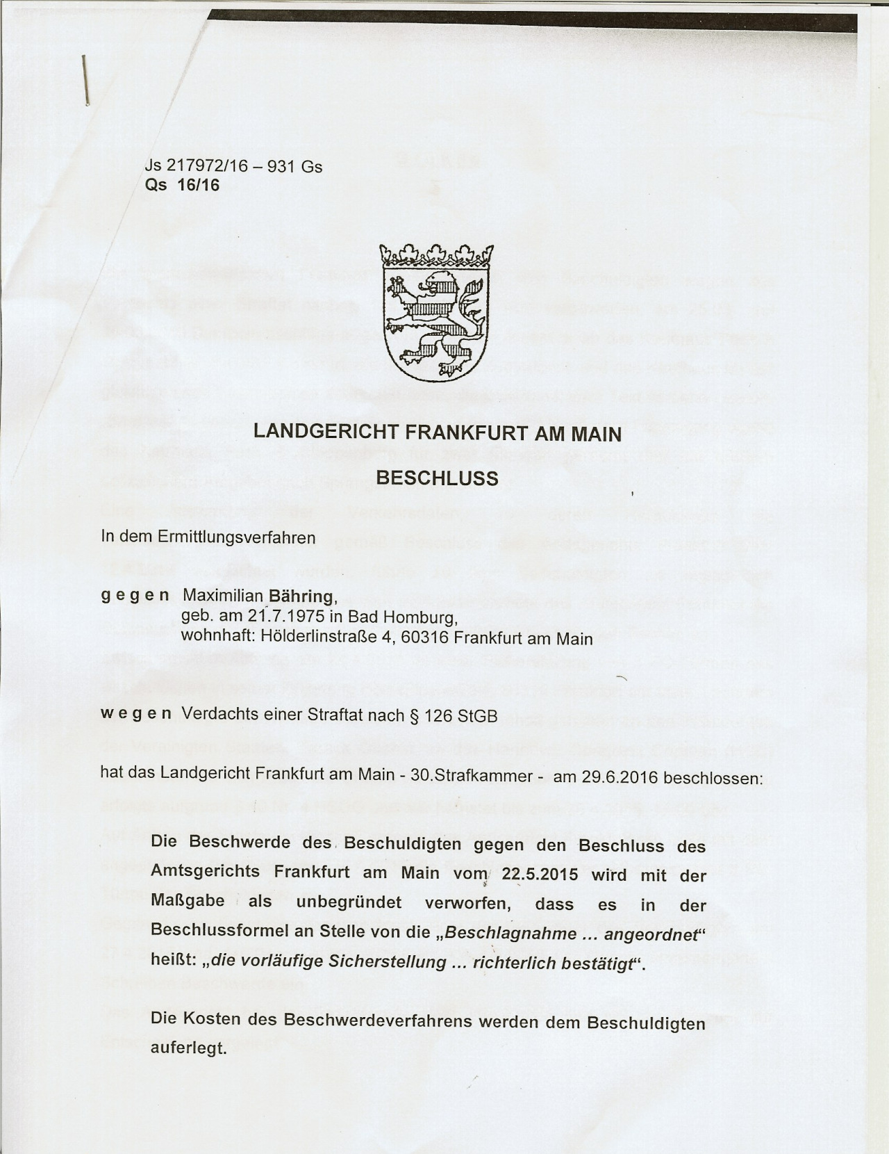 Einschreiben Einwurf vorab per Fax +49/(0)69/1367-2924, u. -6841 o. 8506 Landgericht Hammesgasse 1 D-60313 Frankfurt a.M.