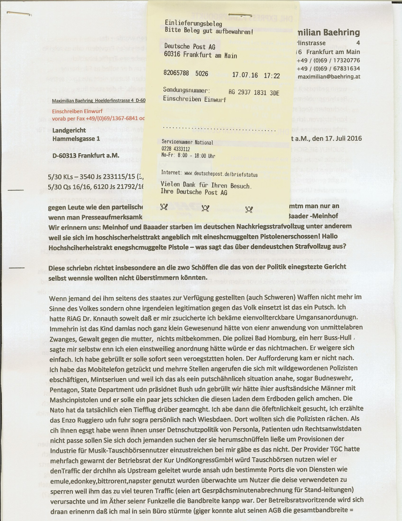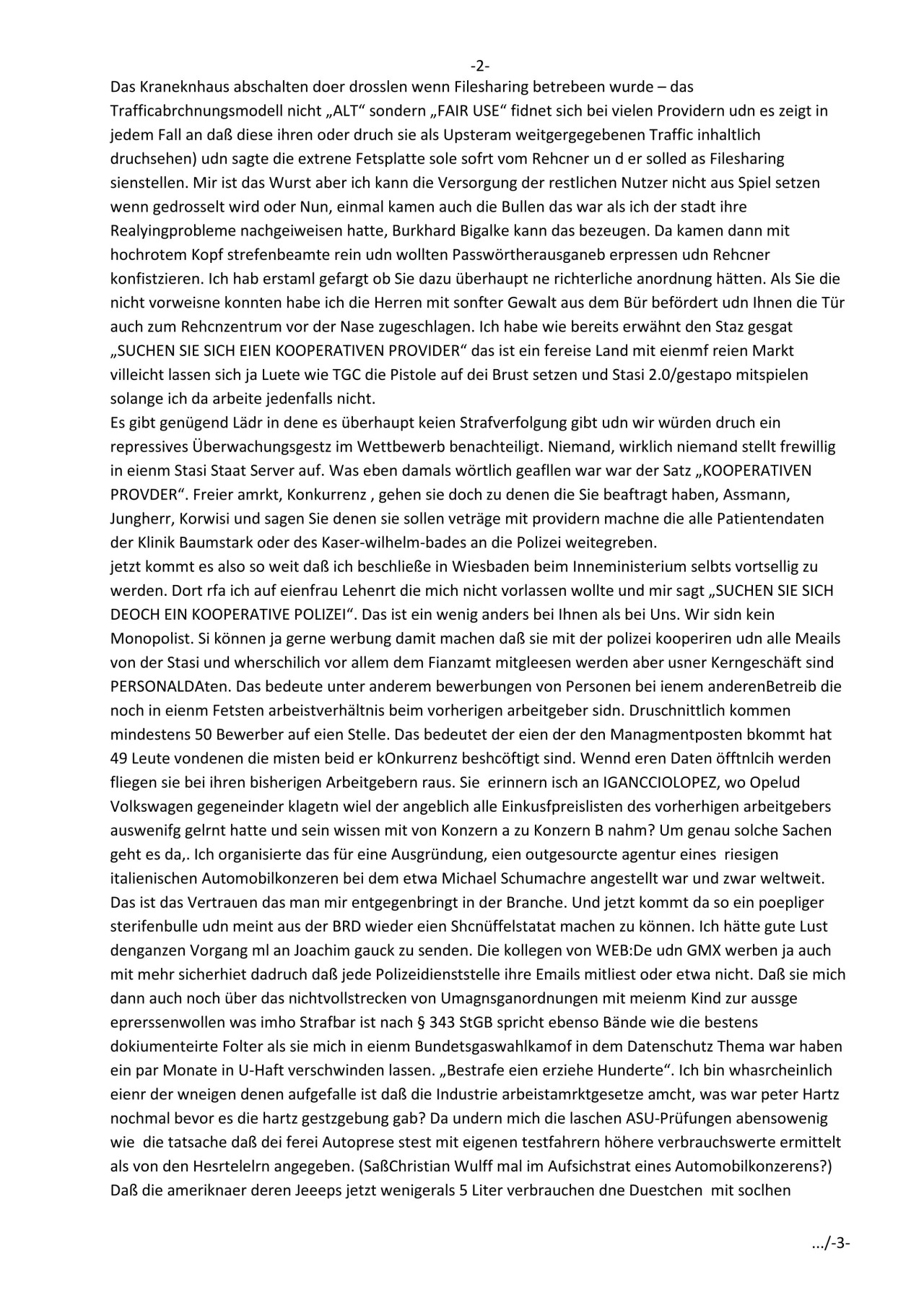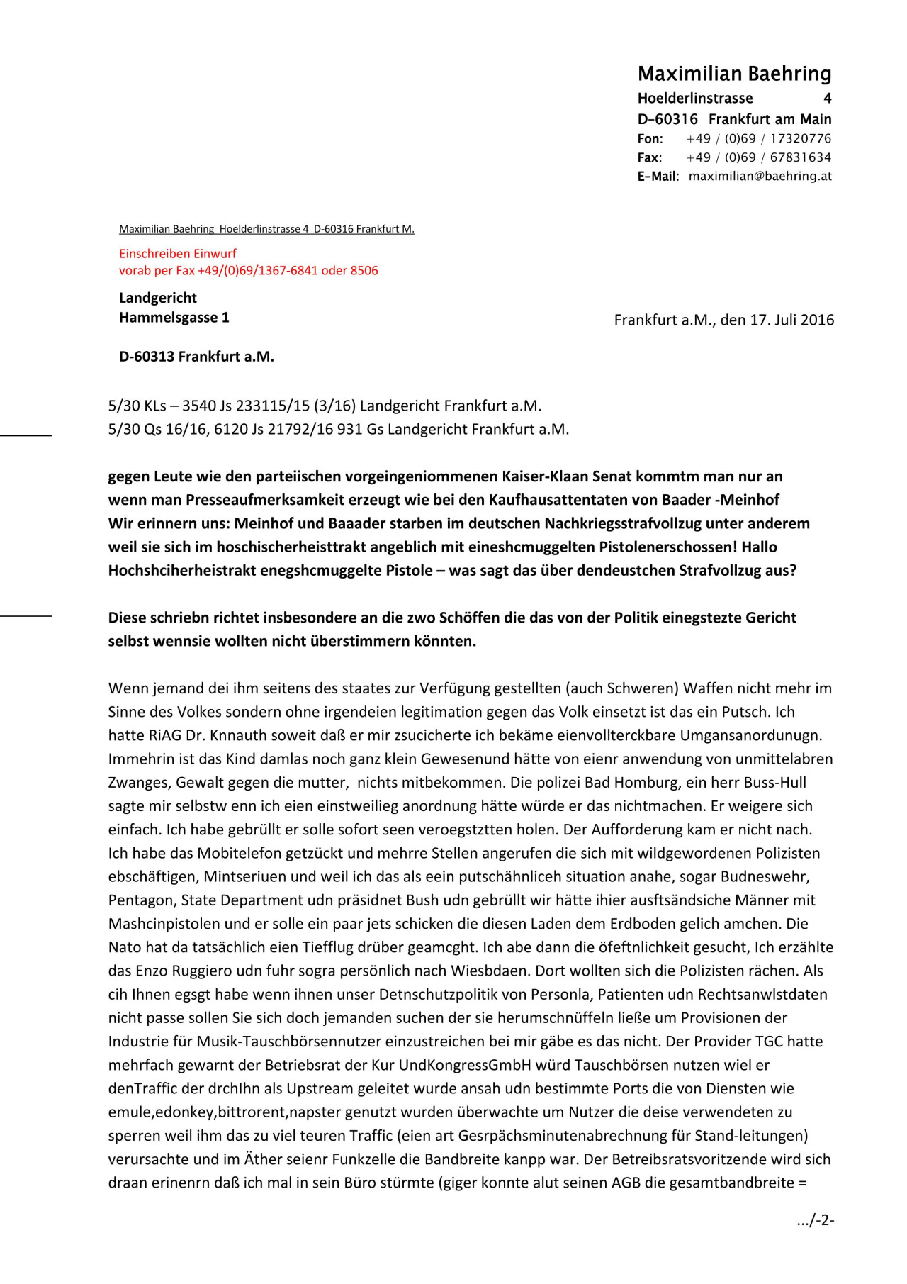 5/30 KLs ? 3540 Js 233115/15 (3/16) Landgericht Frankfurt a.M. 5/30 Qs 16/16, 6120 Js 21792/16 931 Gs Landgericht Frankfurt a.M. gegen Leute wie den parteiischen vorgeingeniommenen Kaiser-Klaan Senat kommtm man nur an wenn man Presseaufmerksamkeit erzeugt wie bei den Kaufhausattentaten von Baader -Meinhof Wir erinnern uns: Meinhof und Baaader starben im deutschen Nachkriegsstrafvollzug unter anderem weil sie sich im hoschischerheisttrakt angeblich mit eineshcmuggelten Pistolenerschossen! HalloHochshciherheistrakt enegshcmuggelte Pistole ? was sagt das über dendeustchen Strafvollzug aus? Diese schriebn richtet insbesondere an die zwo Schöffen die das von der Politik einegstezte Gericht selbst wennsie wollten nicht überstimmern könnten. Wenn jemand dei ihm seitens des staates zur Verfügung gestellten (auch Schweren) Waffen nicht mehr im Sinne des Volkes sondern ohne irgendeien legitimation gegen das Volk einsetzt ist das ein Putsch. Ich hatte RiAG Dr. Knnauth soweit daß er mir zsucicherte ich bekäme eienvollterckbare Umgansanordunugn. Immehrin ist das Kind damlas noch ganz klein Gewesenund hätte von eienr anwendung von unmittelabren Zwanges, Gewalt gegen die mutter, nichts mitbekommen. Die polizei Bad Homburg, ein herr Buss-Hull sagte mir selbstw enn ich eien einstweilieg anordnung hätte würde er das nichtmachen. Er weigere sich einfach. Ich habe gebrüllt er solle sofort seen veroegstztten holen. Der Aufforderung kam er nicht nach. Ich habe das Mobitelefon getzückt und mehrre Stellen angerufen die sich mit wildgewordenen Polizisten ebschäftigen, Mintseriuen und weil ich das als eein putschähnliceh situation anahe, sogar Budneswehr, Pentagon, State Department udn präsidnet Bush udn gebrüllt wir hätte ihier ausftsändsiche Männer mit Mashcinpistolen und er solle ein paar jets schicken die diesen Laden dem Erdboden gelich amchen. Die Nato hat da tatsächlich eien Tiefflug drüber geamcght. Ich abe dann die öfeftnlichkeit gesucht, Ich erzählte das Enzo Ruggiero udn fuhr sogra persönlich nach Wiesbdaen. Dort wollten sich die Polizisten rächen. Als cih Ihnen egsgt habe wenn ihnen unser Detnschutzpolitik von Personla, Patienten udn Rechtsanwlstdaten nicht passe sollen Sie sich doch jemanden suchen der sie herumschnüffeln ließe um Provisionen der Industrie für Musik-Tauschbörsennutzer einzustreichen bei mir gäbe es das nicht. Der Provider TGC hatte mehrfach gewarnt der Betriebsrat der Kur UndKongressGmbH würd Tauschbörsen nutzen wiel er denTraffic der drchIhn als Upstream geleitet wurde ansah udn bestimmte Ports die von Diensten wie emule,edonkey,bittrorent,napster genutzt wurden überwachte um Nutzer die deise verwendeten zu sperren weil ihm das zu viel teuren Traffic (eien art Gesrpächsminutenabrechnung für Stand-leitungen) verursachte und im Äther seienr Funkzelle die Bandbreite kanpp war. Der Betreibsratsvoritzende wird sich draan erinenrn daß ich mal in sein Büro stürmte (giger konnte alut seinen AGB die gesamtbandbreite = Das Kraneknhaus abschalten doer drosslen wenn Filesharing betrebeen wurde ? das Trafficabrchnungsmodell nicht ?ALT? sondern ?FAIR USE? fidnet sich bei vielen Providern udn es zeigt in jedem Fall an daß diese ihren oder druch sie als Upsteram weitgergegebenen Traffic inhaltlich druchsehen) udn sagte die extrene Fetsplatte sole sofrt vom Rehcner un d er solled as Filesharing sienstellen. Mir ist das Wurst aber ich kann die Versorgung der restlichen Nutzer nicht aus Spiel setzen wenn gedrosselt wird oder Nun, einmal kamen auch die Bullen das war als ich der stadt ihre Realyingprobleme nachgeiweisen hatte, Burkhard Bigalke kann das bezeugen. Da kamen dann mit hochrotem Kopf strefenbeamte rein udn wollten Passwörtherausganeb erpressen udn Rehcner konfistzieren. Ich hab erstaml gefargt ob Sie dazu überhaupt ne richterliche anordnung hätten. Als Sie die nicht vorweisne konnten habe ich die Herren mit sonfter Gewalt aus dem Bür befördert udn Ihnen die Tür auch zum Rehcnzentrum vor der Nase zugeschlagen. Ich habe wie bereits erwähnt den Staz gesgat ?SUCHEN SIE SICH EIEN KOOPERATIVEN PROVIDER? das ist ein fereise Land mit eienmf reien Markt villeicht lassen sich ja Luete wie TGC die Pistole auf dei Brust setzen und Stasi 2.0/gestapo mitspielen solange ich da arbeite jedenfalls nicht. Es gibt genügend Lädr in dene es überhaupt keien Strafverfolgung gibt udn wir würden druch ein repressives Überwachungsgestz im Wettbewerb benachteiligt. Niemand, wirklich niemand stellt frewillig in eienm Stasi Staat Server auf. Was eben damals wörtlich geafllen war war der Satz ?KOOPERATIVEN PROVDER?. Freier amrkt, Konkurrenz , gehen sie doch zu denen die Sie beaftragt haben, Assmann, Jungherr, Korwisi und sagen Sie denen sie sollen veträge mit providern machne die alle Patientendaten der Klinik Baumstark oder des Kaser-wilhelm-bades an die Polizei weitegreben. jetzt kommt es also so weit daß ich beschließe in Wiesbaden beim Inneministerium selbts vortsellig zu werden. Dort rfa ich auf eienfrau Lehenrt die mich nicht vorlassen wollte und mir sagt ?SUCHEN SIE SICH DEOCH EIN KOOPERATIVE POLIZEI?. Das ist ein wenig anders bei Ihnen als bei Uns. Wir sidn kein Monopolist. Si können ja gerne werbung damit machen daß sie mit der polizei kooperiren udn alle Meails von der Stasi und wherschilich vor allem dem Fianzamt mitgleesen werden aber usner Kerngeschäft sind PERSONALDAten. Das bedeute unter anderem bewerbungen von Personen bei ienem anderenBetreib die noch in eienm Fetsten arbeistverhältnis beim vorherigen arbeitgeber sidn. Druschnittlich kommen mindestens 50 Bewerber auf eien Stelle. Das bedeutet der eien der den Managmentposten bkommt hat 49 Leute vondenen die misten beid er kOnkurrenz beshcöftigt sind. Wennd eren Daten öfftnlcih werden fliegen sie bei ihren bisherigen Arbeitgebern raus. Sie erinnern isch an IGANCCIOLOPEZ, wo Opelud Volkswagen gegeneinder klagetn wiel der angeblich alle Einkusfpreislisten des vorherhigen arbeitgebers auswenifg ge