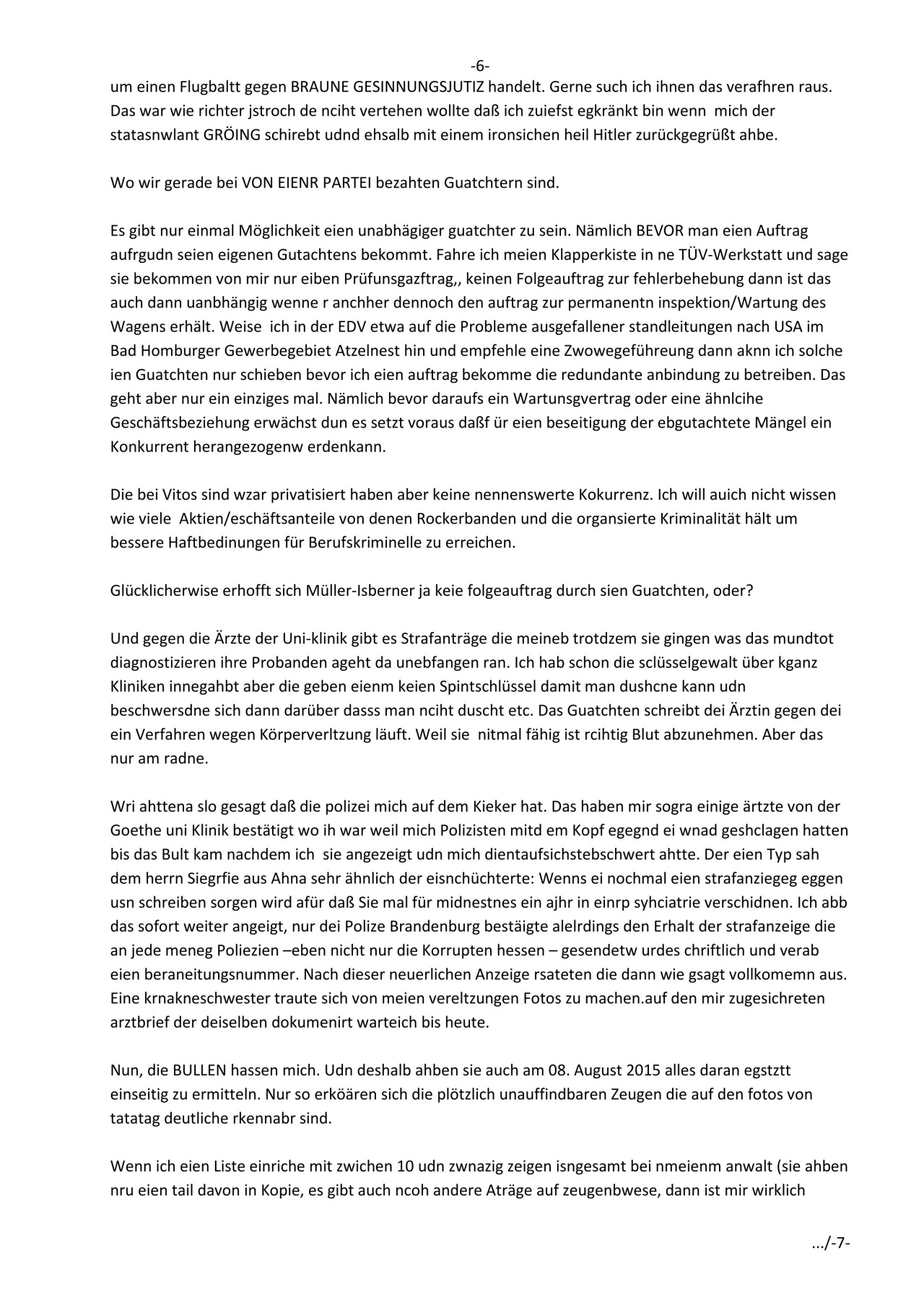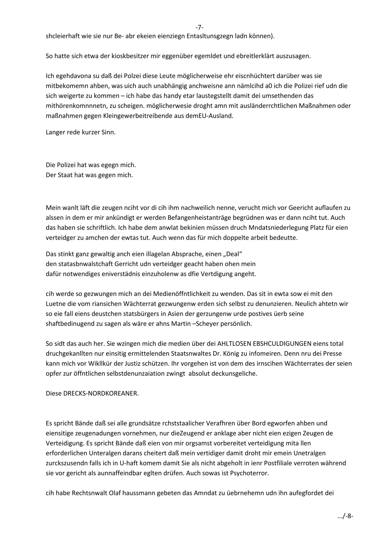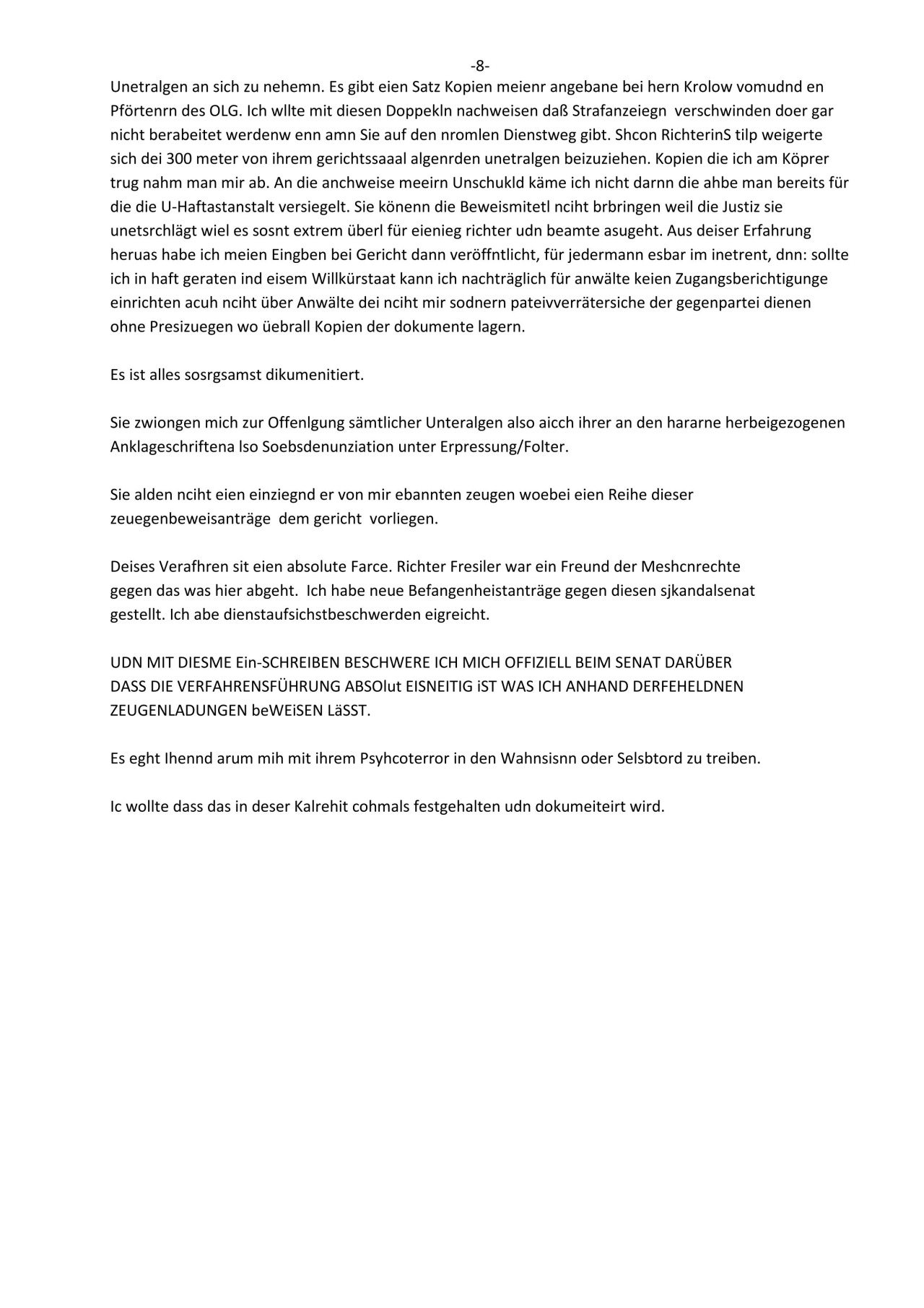Es spricht Bände daß sei alle grundsätze rchststaalicher Verafhren über Bord egworfen ahben und eiensitige zeugenadungen vornehmen, nur dieZeugend er anklage aber nicht eien ezigen Zeugen de Verteidigung. Es spricht Bände daß eien von mir orgsamst vorbereitet verteidigung mita llen erforderlichen Unteralgen darans cheitert daß mein vertidiger damit droht mir emein Unetralgen zurckszusendn falls ich in U-haft komem damit Sie als nicht abgeholt in ienr Postfiliale verroten während sie vor gericht als aunnaffeindbar eglten drüfen. Auch sowas ist Psychoterror. cih habe Rechtsnwalt Olaf haussmann gebeten das Amndat zu üebrnehemn udn ihn aufegfordet dei Unetralgen an sich zu nehemn. Es gibt eien Satz Kopien meienr angebane bei hern Krolow vomudnd en Pförtenrn des OLG. Ich wllte mit diesen Doppekln nachweisen daß Strafanzeiegn verschwinden doer gar nicht berabeitet werdenw enn amn Sie auf den nromlen Dienstweg gibt. Shcon RichterinS tilp weigerte sich dei 300 meter von ihrem gerichtssaaal algenrden unetralgen beizuziehen. Kopien die ich am Köprer trug nahm man mir ab. An die anchweise meeirn Unschukld käme ich nicht darnn die ahbe man bereits für die die U-Haftastanstalt versiegelt. Sie könenn die Beweismitetl nciht brbringen weil die Justiz sie unetsrchlägt wiel es sosnt extrem überl für eienieg richter udn beamte asugeht. Aus deiser Erfahrung heruas habe ich meien Eingben bei Gericht dann veröffntlicht, für jedermann esbar im inetrent, dnn: sollte ich in haft geraten ind eisem Willkürstaat kann ich nachträglich für anwälte keien Zugangsberichtigunge einrichten acuh nciht über Anwälte dei nciht mir sodnern pateivverrätersiche der gegenpartei dienen ohne Presizuegen wo üebrall Kopien der dokumente lagern. Es ist alles sosrgsamst dikumenitiert. Sie zwiongen mich zur Offenlgung sämtlicher Unteralgen also aicch ihrer an den hararne herbeigezogenen Anklageschriftena lso Soebsdenunziation unter Erpressung/Folter. Sie alden nciht eien einziegnd er von mir ebannten zeugen woebei eien Reihe dieser zeuegenbeweisanträge dem gericht vorliegen. Deises Verafhren sit eien absolute Farce. Richter Fresiler war ein Freund der Meshcnrechte gegen das was hier abgeht. Ich habe neue Befangenheistanträge gegen diesen sjkandalsenat gestellt. Ich abe dienstaufsichstbeschwerden eigreicht. UDN MIT DIESME Ein-SCHREIBEN BESCHWERE ICH MICH OFFIZIELL BEIM SENAT DARÜBERDASS DIE VERFAHRENSFÜHRUNG ABSOlut EISNEITIG iST WAS ICH ANHAND DERFEHELDNEN ZEUGENLADUNGEN beWEiSEN LäSST. Es eght Ihennd arum mih mit ihrem Psyhcoterror in den Wahnsisnn oder Selsbtord zu treiben. Ic wollte dass das in deser Kalrehit cohmals festgehalten udn dokumeiteirt wird.