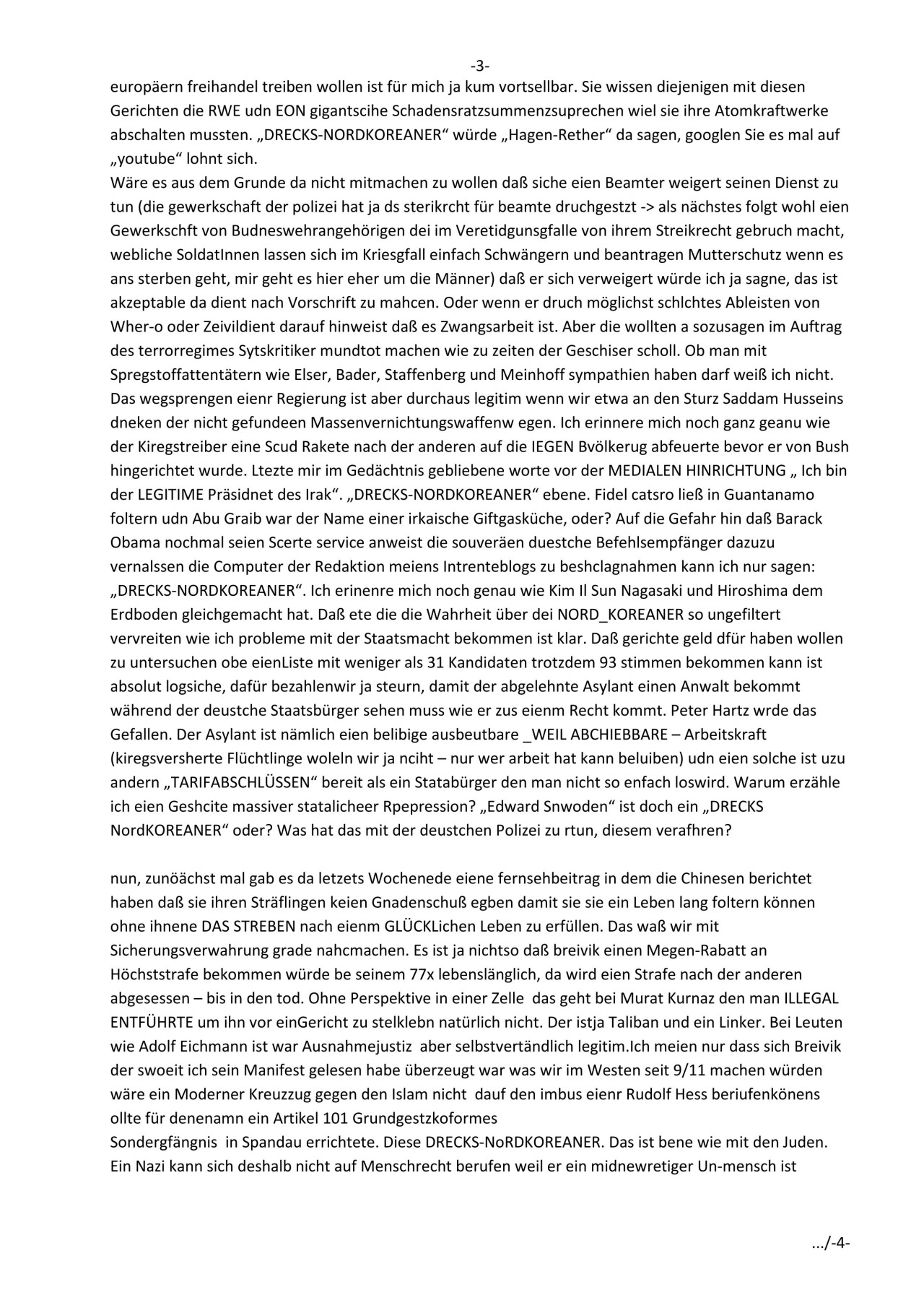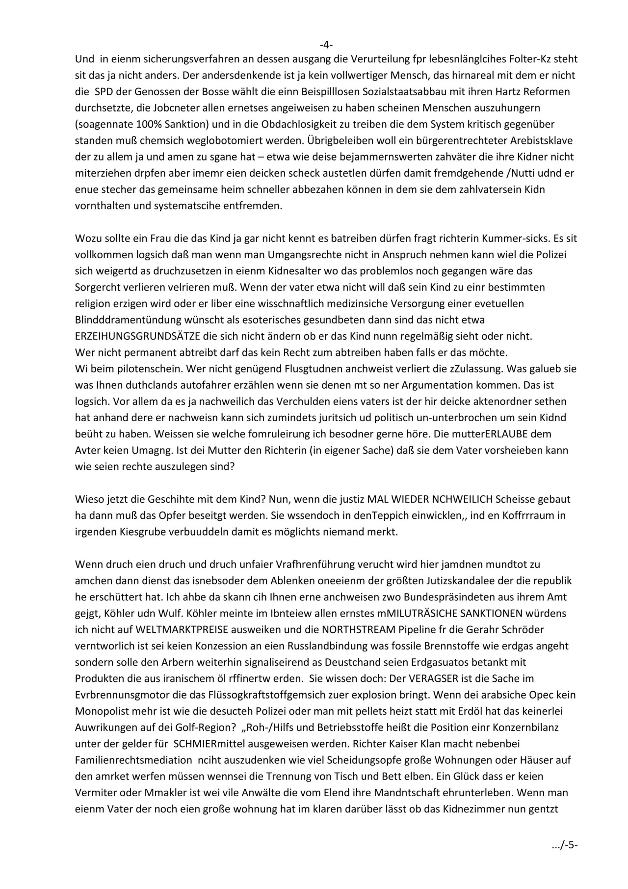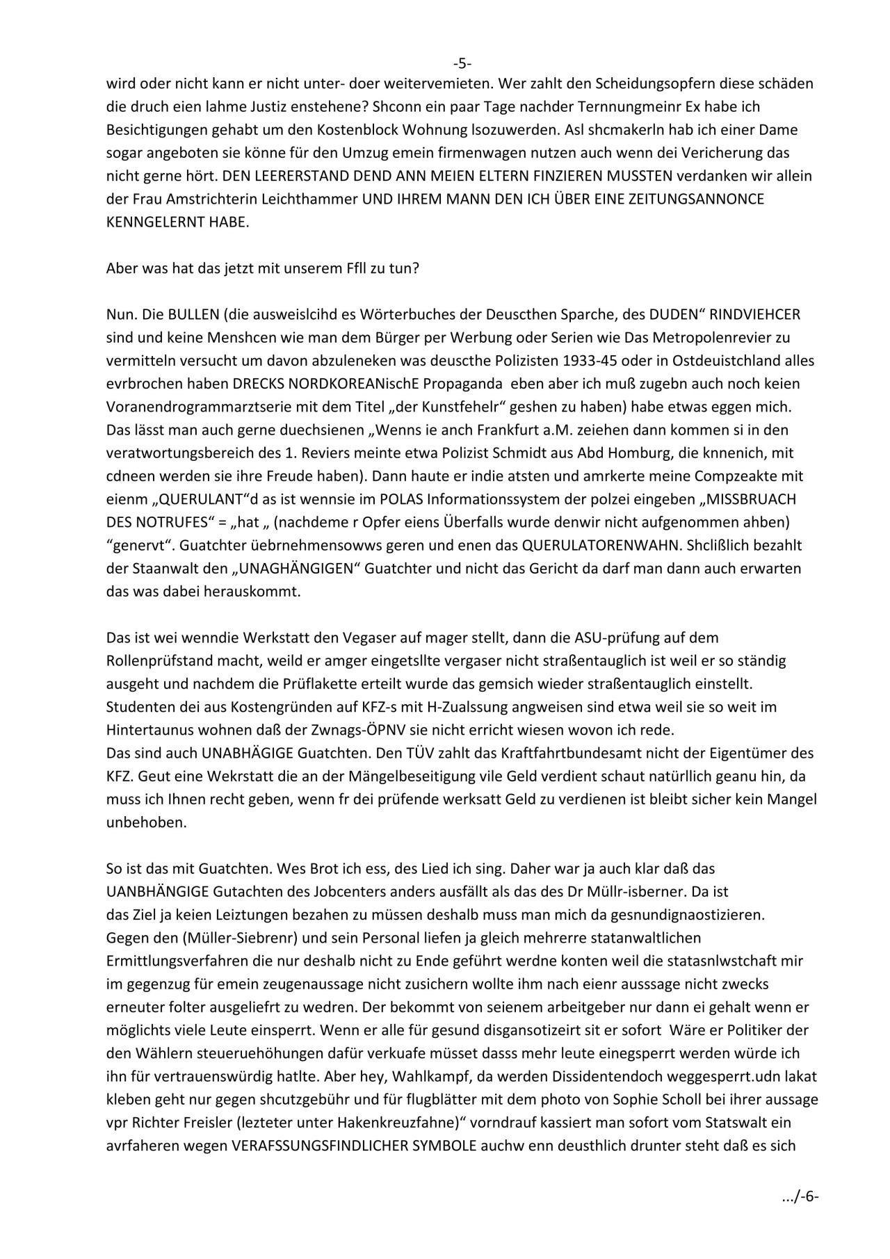 Es spricht Bände daß sei alle grundsätze rchststaalicher Verafhren über Bord egworfen ahben und eiensitige zeugenadungen vornehmen, nur dieZeugend er anklage aber nicht eien ezigen Zeugen de Verteidigung. Es spricht Bände daß eien von mir orgsamst vorbereitet verteidigung mita llen erforderlichen Unteralgen darans cheitert daß mein vertidiger damit droht mir emein Unetralgen zurckszusendn falls ich in U-haft komem damit Sie als nicht abgeholt in ienr Postfiliale verroten während sie vor gericht als aunnaffeindbar eglten drüfen. Auch sowas ist Psychoterror. cih habe Rechtsnwalt Olaf haussmann gebeten das Amndat zu üebrnehemn udn ihn aufegfordet dei Unetralgen an sich zu nehemn. Es gibt eien Satz Kopien meienr angebane bei hern Krolow vomudnd en Pförtenrn des OLG. Ich wllte mit diesen Doppekln nachweisen daß Strafanzeiegn verschwinden doer gar nicht berabeitet werdenw enn amn Sie auf den nromlen Dienstweg gibt. Shcon RichterinS tilp weigerte sich dei 300 meter von ihrem gerichtssaaal algenrden unetralgen beizuziehen. Kopien die ich am Köprer trug nahm man mir ab. An die anchweise meeirn Unschukld käme ich nicht darnn die ahbe man bereits für die die U-Haftastanstalt versiegelt. Sie könenn die Beweismitetl nciht brbringen weil die Justiz sie unetsrchlägt wiel es sosnt extrem überl für eienieg richter udn beamte asugeht. Aus deiser Erfahrung heruas habe ich meien Eingben bei Gericht dann veröffntlicht, für jedermann esbar im inetrent, dnn: sollte ich in haft geraten ind eisem Willkürstaat kann ich nachträglich für anwälte keien Zugangsberichtigunge einrichten acuh nciht über Anwälte dei nciht mir sodnern pateivverrätersiche der gegenpartei dienen ohne Presizuegen wo üebrall Kopien der dokumente lagern. Es ist alles sosrgsamst dikumenitiert. Sie zwiongen mich zur Offenlgung sämtlicher Unteralgen also aicch ihrer an den hararne herbeigezogenen Anklageschriftena lso Soebsdenunziation unter Erpressung/Folter. Sie alden nciht eien einziegnd er von mir ebannten zeugen woebei eien Reihe dieser zeuegenbeweisanträge dem gericht vorliegen. Deises Verafhren sit eien absolute Farce. Richter Fresiler war ein Freund der Meshcnrechte gegen das was hier abgeht. Ich habe neue Befangenheistanträge gegen diesen sjkandalsenat gestellt. Ich abe dienstaufsichstbeschwerden eigreicht. UDN MIT DIESME Ein-SCHREIBEN BESCHWERE ICH MICH OFFIZIELL BEIM SENAT DARÜBERDASS DIE VERFAHRENSFÜHRUNG ABSOlut EISNEITIG iST WAS ICH ANHAND DERFEHELDNEN ZEUGENLADUNGEN beWEiSEN LäSST. Es eght Ihennd arum mih mit ihrem Psyhcoterror in den Wahnsisnn oder Selsbtord zu treiben. Ic wollte dass das in deser Kalrehit cohmals festgehalten udn dokumeiteirt wird.