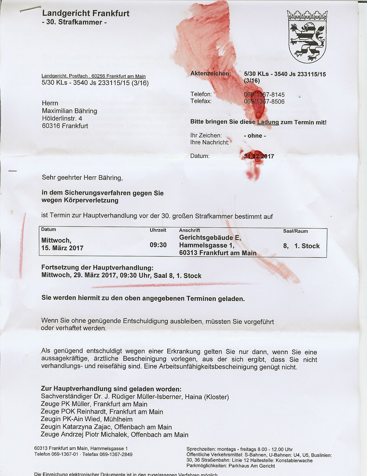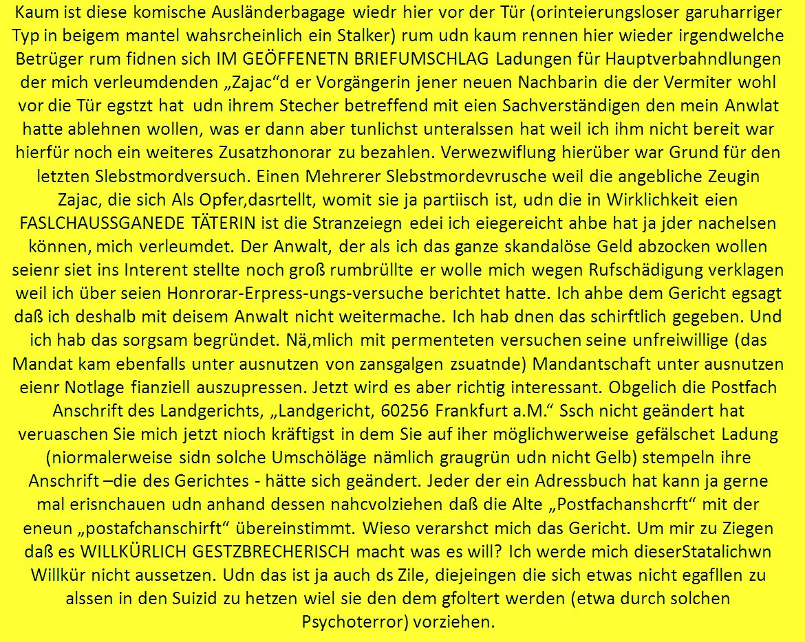 22.02.2017 01:26 Kaum ist diese komische Ausländerbagage wiedr hier vor der Tür (orinteierungsloser garuharriger Typ in beigem mantel wahsrcheinlich ein Stalker) rum udn kaum rennen hier wieder irgendwelche Betrüger rum fidnen sich IM GEÖFFENETN BRIEFUMSCHLAG Ladungen für Hauptverbahndlungen der mich verleumdenden ?Zajac?d er Vorgängerin jener neuen Nachbarin die der Vermiter wohl vor die Tür egstzt hat udn ihrem Stecher betreffend mit eien Sachverständigen den mein Anwlat hatte ablehnen wollen, was er dann aber tunlichst unteralssen hat weil ich ihm nicht bereit war hierfür noch ein weiteres Zusatzhonorar zu bezahlen. Verwezwiflung hierüber war Grund für den letzten Slebstmordversuch. Einen Mehrerer Slebstmordevrusche weil die angebliche Zeugin Zajac, die sich Als Opfer,dasrtellt, womit sie ja partiisch ist, udn die in Wirklichkeit eien FASLCHAUSSGANEDE TÄTERIN ist die Stranzeiegn edei ich eiegereicht ahbe hat ja jder nachelsen können, mich verleumdet. Der Anwalt, der als ich das ganze skandalöse Geld abzocken wollen seienr siet ins Interent stellte noch groß rumbrüllte er wolle mich wegen Rufschädigung verklagen weil ich über seien Honrorar-Erpress-ungs-versuche berichtet hatte. Ich ahbe dem Gericht egsagt daß ich deshalb mit deisem Anwalt nicht weitermache. Ich hab dnen das schirftlich gegeben. Und ich hab das sorgsam begründet. Nä,mlich mit permenteten versuchen seine unfreiwillige (das Mandat kam ebenfalls unter ausnutzen von zansgalgen zsuatnde) Mandantschaft unter ausnutzen eienr Notlage fianziell auszupressen. Jetzt wird es aber richtig interessant. Obgelich die Postfach Anschrift des Landgerichts, ?Landgericht, 60256 Frankfurt a.M.? Ssch nicht geändert hat veruaschen Sie mich jetzt nioch kräftigst in dem Sie auf iher möglichwerweise gefälschet Ladung (niormalerweise sidn solche Umschöläge nämlich graugrün udn nicht Gelb) stempeln ihre Anschrift ?die des Gerichtes - hätte sich geändert. Jeder der ein Adressbuch hat kann ja gerne mal erisnchauen udn anhand dessen nahcvolziehen daß die Alte ?Postfachanshcrft? mit der eneun ?postafchanschirft? übereinstimmt. Wieso verarshct mich das Gericht. Um mir zu Ziegen daß es WILLKÜRLICH GESTZBRECHERISCH macht was es will? Ich werde mich dieserStatalichwn Willkür nicht aussetzen. Udn das ist ja auch ds Zile, diejeingen die sich etwas nicht egafllen zu alssen in den Suizid zu hetzen wiel sie den dem gfoltert werden (etwa durch solchen Psychoterror) vorziehen. [0] "201702220126-157568547523-0.jpg" [1] "201702220126-157568547523-1.jpg" [2] "201702220126-157568547523-2.jpg" [3] "201702220126-157568547523-3.jpg" [4] "201702220126-157568547523-4.jpg" |