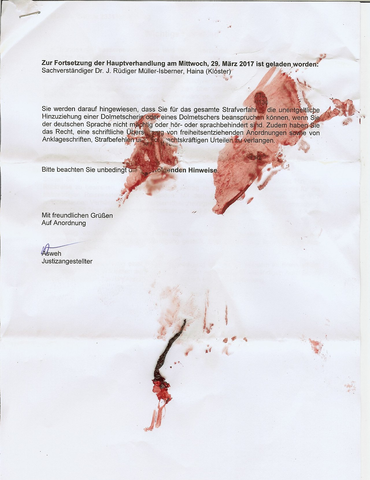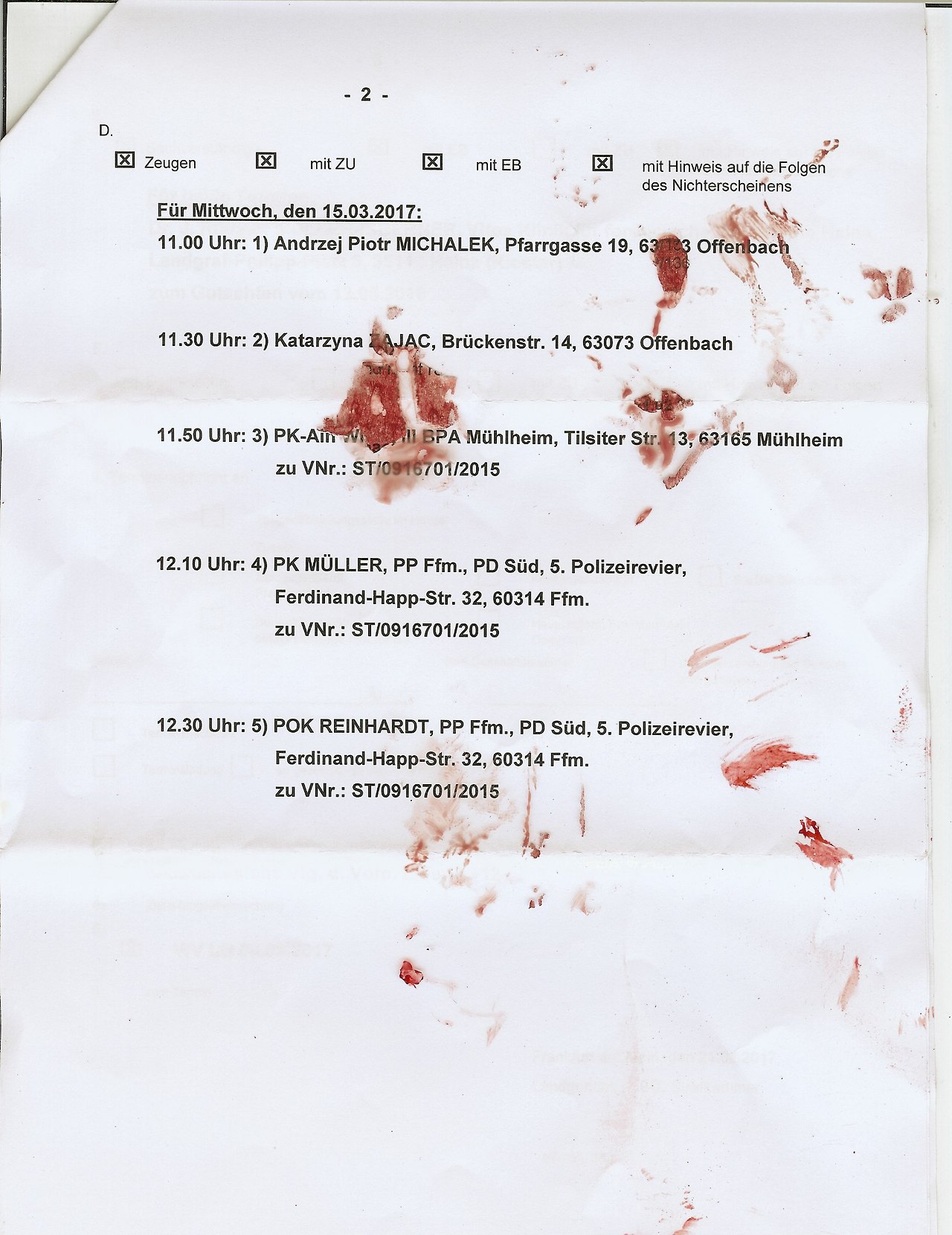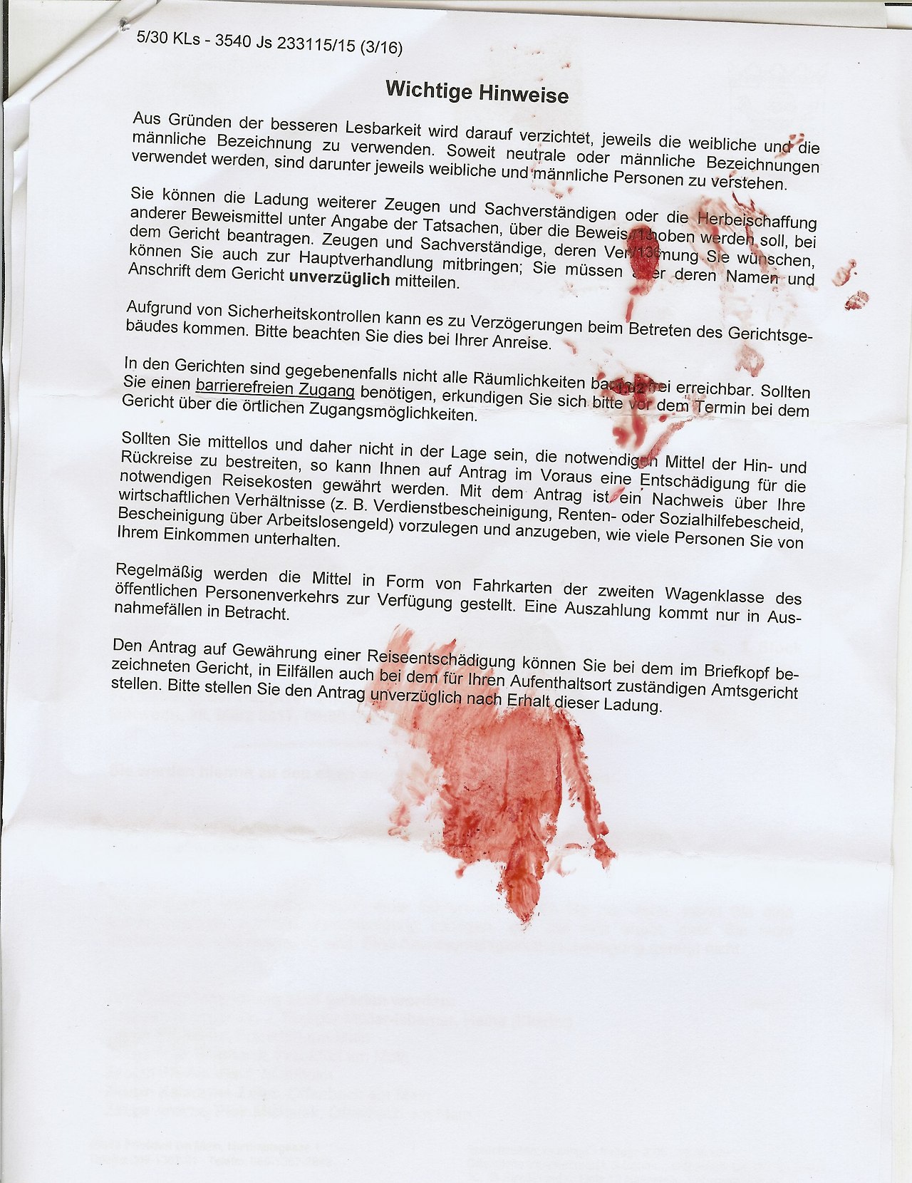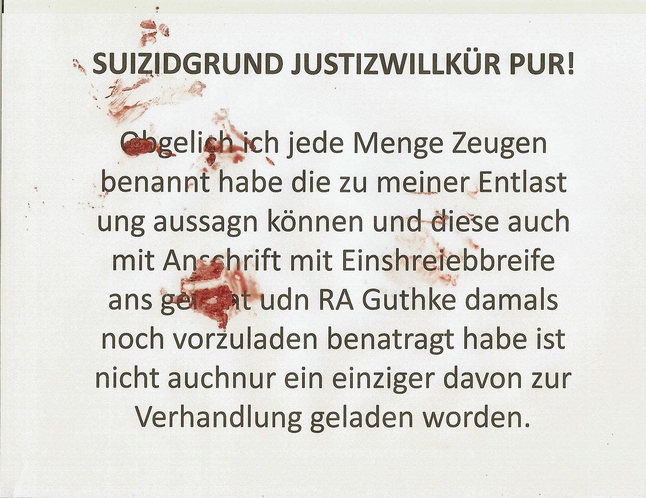 22.02.2017 04:01 SUIZIDGRUND JUSTIZWILLKÜR PUR!Obgelich ich jede Menge Zeugen benannt habe die zu meiner Entlastung aussagn können und diese auch mit Anschrift mit Einshreiebbreife ans gericht udn RA Guthke damalsnoch vorzuladen benatragt habe ist nicht auchnur ein einziger davon zur Verhandlung geladen worden. [0] "201702220401-157572826643-0.jpg" [1] "201702220401-157572826643-1.jpg" [2] "201702220401-157572826643-2.jpg" |