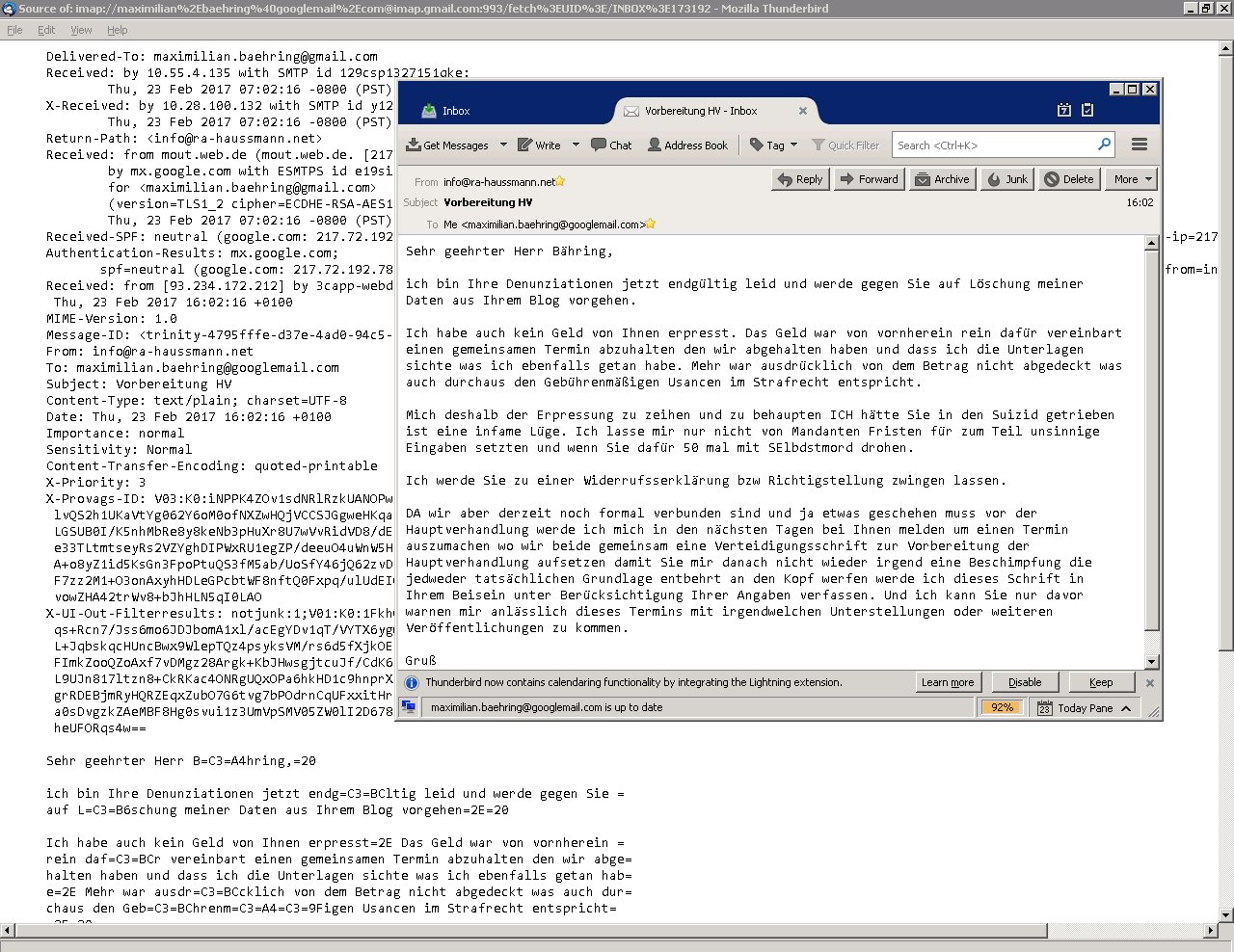 > DA wir aber derzeit noch formal verbunden sind und ja etwas geschehen muss vor der Hauptverhandlung werde ich mich in den nächsten Tagen bei Ihnen melden um einen Termin auszumachen wo wir beide gemeinsam eine Verteidigungsschrift zur Vorbereitung der Hauptverhandlung aufsetzen damit Sie mir danach nicht wieder irgend eine Beschimpfung die jedweder tatsächlichen Grundlage entbehrt an den Kopf werfen werde ich dieses Schrift in Ihrem Beisein unter Berücksichtigung Ihrer Angaben verfassen. Und ich kann Sie nur davor warnen mir anlässlich dieses Termins mit irgendwelchen Unterstellungen oder weiteren Veröffentlichungen zu kommen.