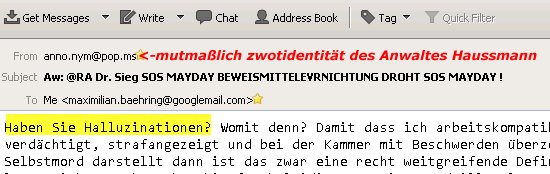 > Mich deshalb der Erpressung zu zeihen und zu behaupten ICH hätte Sie in den Suizid getrieben ist eine infame Lüge. Ich lasse mir nur nicht von Mandanten Fristen für zum Teil unsinnige Eingaben setzten und wenn Sie dafür 50 mal mit SElbdstmord drohen.