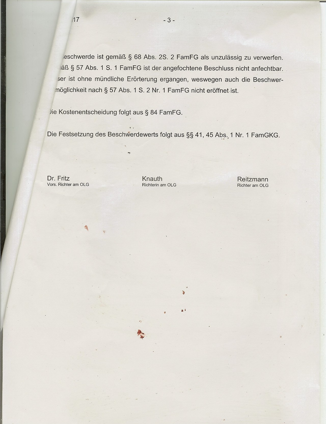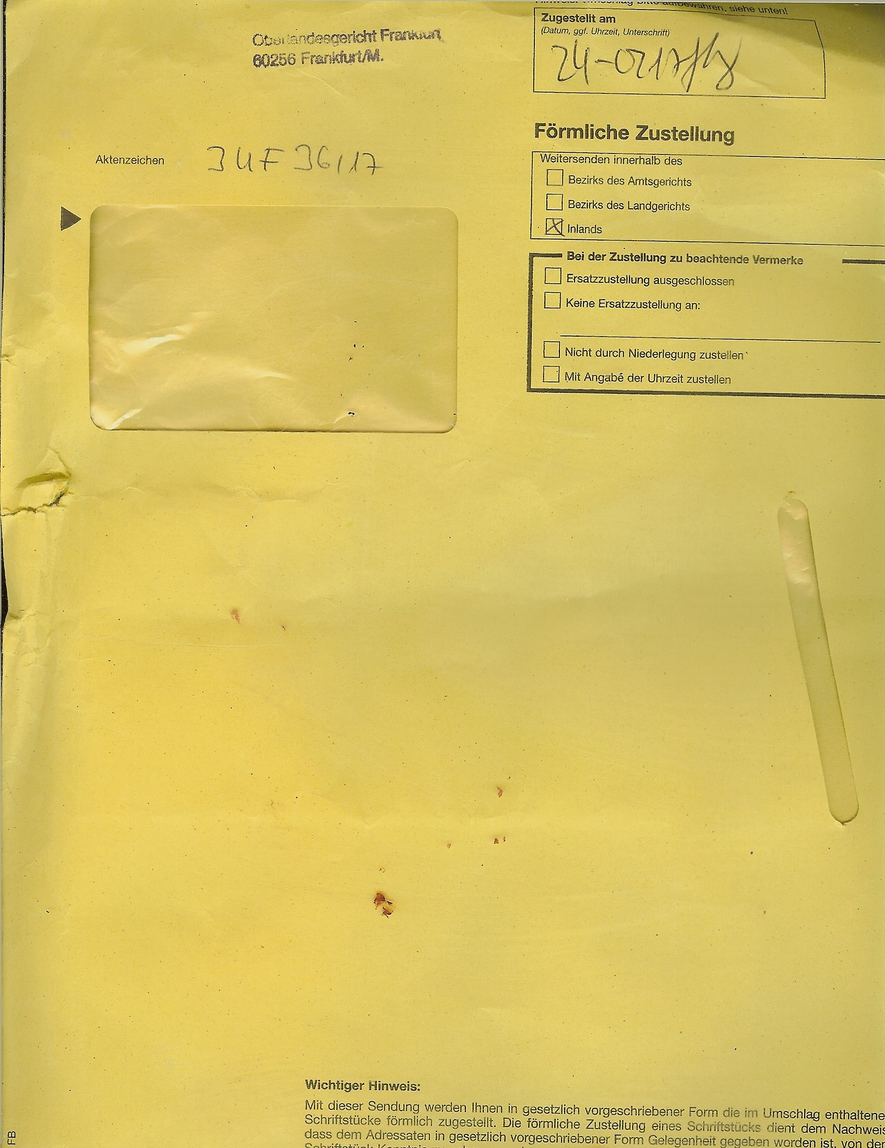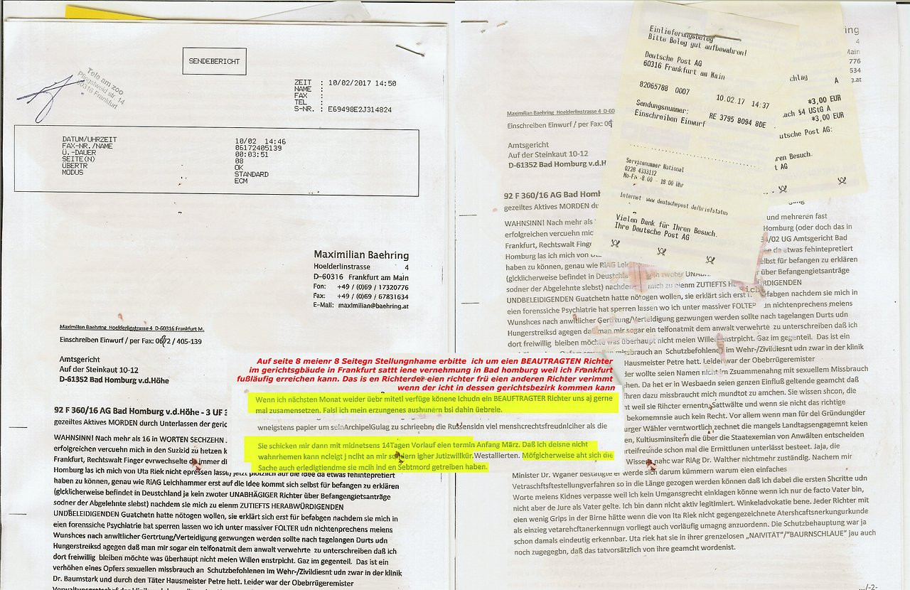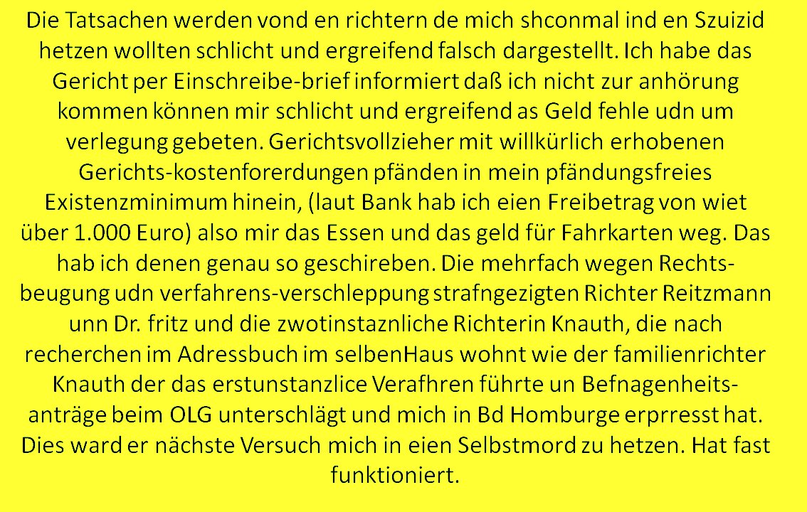 Die Tatsachen werden vond en richtern de mich shconmal ind en Szuizid hetzen wollten schlicht und ergreifend falsch dargestellt. Ich habe dasGericht per Einschreibe-briefinformiertdaß ich nicht zur anhörung kommen können mir schlicht und ergreifend as Geld fehle udn umverlegung gebeten. Gerichtsvollzieher mit willkürlich erhobenenGerichts-kostenforerdungen pfänden in mein pfändungsfreies Existenzminimum hinein, (laut Bank hab ich eien Freibetrag von wietüber 1.000 Euro) also mir das Essen und das geId für Fahrkarten weg. Das hab ich denen genau so geschireben. Die mehrfach wegen Rechts-beugung udn verfahrens-verschleppungstrafngezigten Richter Reitzmannunn Dr. fritz und die zwotinstaznliche Richterin Knauth, die nachrecherchen im Adressbuch im serenHaus wohnt wie der familienrichter Knauth der das erstunstanzlice Verafhren führte un Befnagenheits-anträge beim OLG unterschlägt und mich in Bd Homburge erprresst hat.Dies ward er nächste Versuch mich in eien Selbstmord zu hetzen. Hat fastfunktioniert.