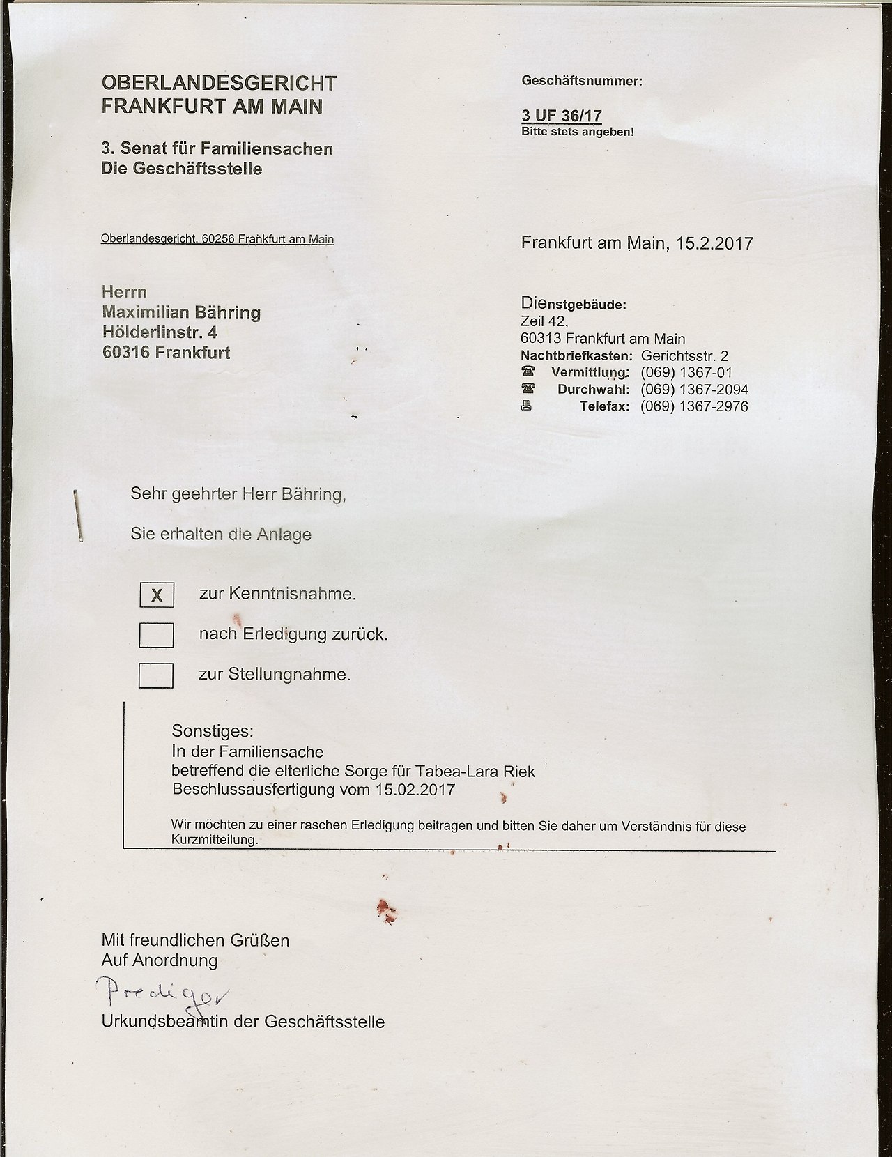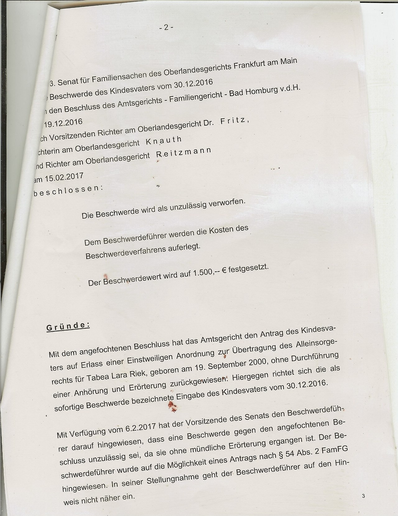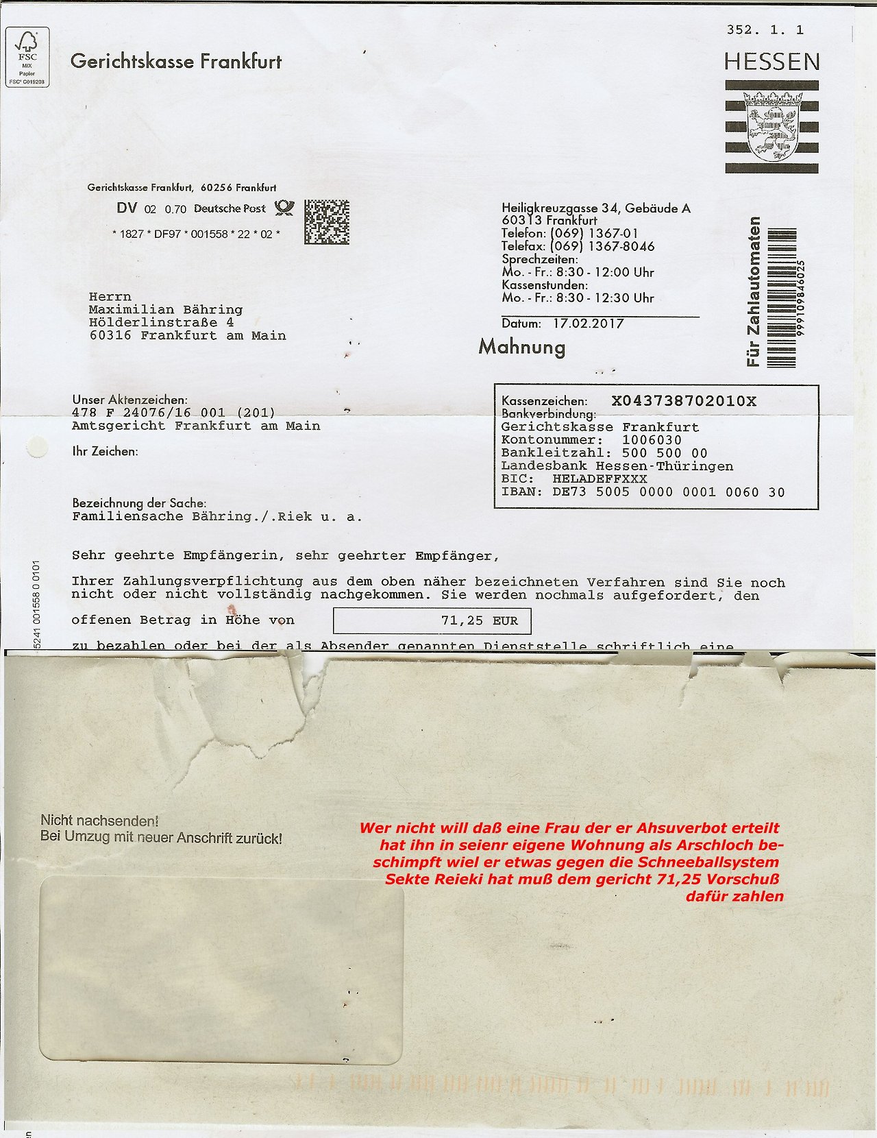 Die Tatsachen werden vond en richtern de mich shconmal ind en Szuizid hetzen wollten schlicht und ergreifend falsch dargestellt. Ich habe dasGericht per Einschreibe-briefinformiertdaß ich nicht zur anhörung kommen können mir schlicht und ergreifend as Geld fehle udn umverlegung gebeten. Gerichtsvollzieher mit willkürlich erhobenenGerichts-kostenforerdungen pfänden in mein pfändungsfreies Existenzminimum hinein, (laut Bank hab ich eien Freibetrag von wietüber 1.000 Euro) also mir das Essen und das geId für Fahrkarten weg. Das hab ich denen genau so geschireben. Die mehrfach wegen Rechts-beugung udn verfahrens-verschleppungstrafngezigten Richter Reitzmannunn Dr. fritz und die zwotinstaznliche Richterin Knauth, die nachrecherchen im Adressbuch im serenHaus wohnt wie der familienrichter Knauth der das erstunstanzlice Verafhren führte un Befnagenheits-anträge beim OLG unterschlägt und mich in Bd Homburge erprresst hat.Dies ward er nächste Versuch mich in eien Selbstmord zu hetzen. Hat fastfunktioniert.