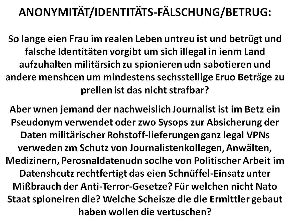 19.03.2017 07:12 ANONYMITÄT/IDENTITÄTS-FÄLSCHUNG/BETRUG:So lange eien Frau im realen Leben untreu ist und betrügt und falsche Identitäten vorgibt um sich illegal in ienm Land aufzuhalten militärsich zu spionieren udn sabotieren und andere menshcen um mindestens sechsstellige Eruo Beträge zu prellen ist das nicht strafbar?Aber wnen jemand der nachweislich Journalist ist im Betz ein Pseudonym verwendet oder zwo Sysops zur Absicherung der Daten militärischer Rohstoff-lieferungen ganz legal VPNs verweden zm Schutz von Journalistenkollegen, Anwälten, Medizinern, Perosnaldatenudn soclhe von Politischer Arbeit im Datenshcutz rechtfertigt das eien Schnüffel-Einsatz unter Mißbrauch der Anti-Terror-Gesetze? Für welchen nicht Nato Staat spioneiren die? Welche Scheisze die die Ermittler gebaut haben wollen die vertuschen? [0] "201703190712-158596780823-0.jpg" [1] "201703190712-158596780823-1.jpg" [2] "201703190712-158596780823-2.jpg" [3] "201703190712-158596780823-3.jpg" [4] "201703190712-158596780823-4.jpg" |