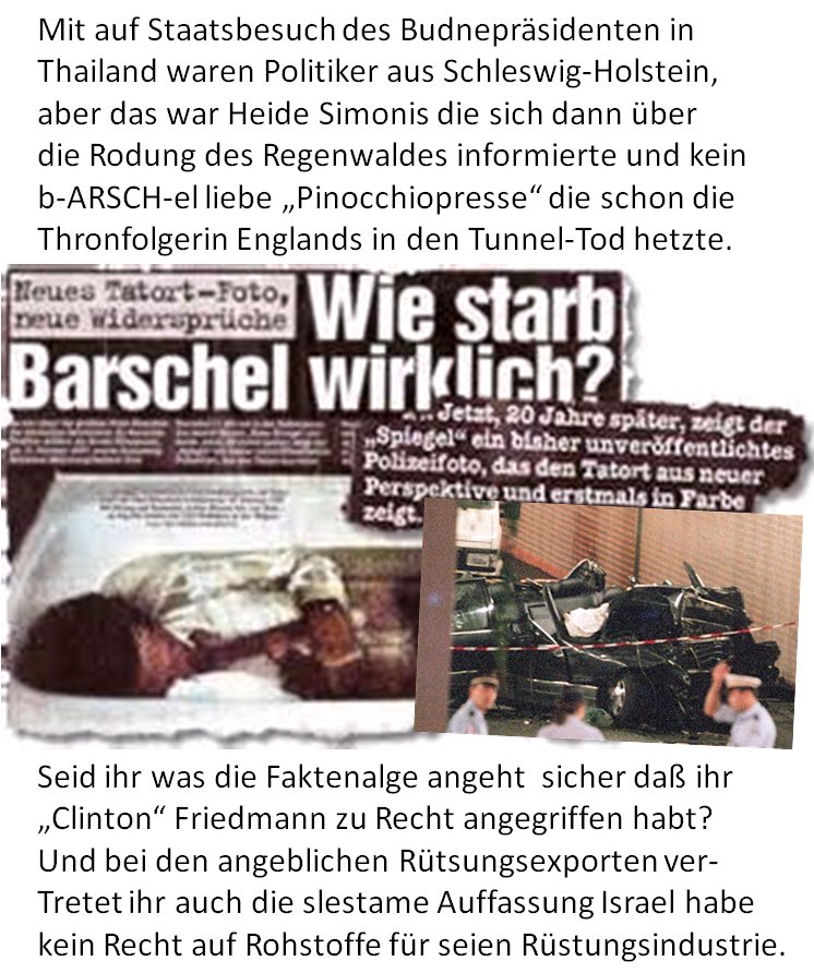 19.03.2017 07:50 Ich hatte mal zu meirn Zeit inder shcülerzeitung Besuch von eeinr Grupep vo arabs die soch wohld as vertrauen zu einigenfriedrichsdorfer redakteuren dadruch erschlichen hatten daß sie and iese Marjiuna oder Gras verterilthatten. Das war ein witerer Eisnchüchterunsgevrsuch aus demOrinet, zuvor hatte man sich über den Terminus ILLLAGALE beschwert mit dem Menshcne gemeint wraen die sich hier Illaegal aufhielten um illagela (mest handwerer)tätigkeiten nachzugehnen. Ich erinenre mich noch ganz genau wie die arber der meinungw aren daß enn jemadn einAuto erstellt udn ein Andere fährt mit deisem Auto jeamdnen tot, daß es dann slebsverständlichd er Hersteer des Wganes sei,d er Shculd sei. Man hatte wohl was gegen die jüdische Gründer-/Hauptzeigentümerfailie (nicht degussa, nicht Tothschild, die andern, die mit dem eiegen Stadtviertel) eiens großen DAX-notierten Rohtsoffhandelsunternehmens daß die isrealis so belieferte daß die fähig waren Waffen zu bauen umsich lsebt zu verteidgen. Etwa Panzerabwehrewaffen. Üerhuat solle man doch Liber Dinge ausplastik fertigen denn Metalle wären ja in Kiregeschiffen, Flugziegen und Panzern vorhaden udn so gesehn würden Thyssen udn Krupp ja am abschlachten der Plaästineser mitverwantworlich sien.antifa Logik eben. Kurze Ziet gab es spekulationen über Warneteminegschäftse m8it Öl und danach zug dr Konzern von seienm Stammsitz hinter der alten IOper nachin Frankfurt nach Bochum wobie tausende arbeistplätze verloren gingen.Ich erwähne daß deshalb weil dort an der altenOper immer die Antifa-Spinner demonstrierten was ich jedes Wochenende besichtigen konnte wenn vaters ieen Wgane auf demFirmengelände parkte udn wir üebr die Freßgaß in Richtung Stadtmitte shoppen gingen. https://en.wikipedia.org/wiki/Israel_Military_Industries Mit auf Staatsbesuch des Budnepräsidenten in Thailand waren Politiker aus Schleswig-Holstein, aber das war Heide Simonis die sich dann überdie Rodung des Regenwaldes informierte und kein b-ARSCH-el liebe ?Pinocchiopresse? die schon die Thronfolgerin Englands in den Tunnel-Tod hetzte. [0] "201703190750-158579455928-0.jpg" [1] "201703190750-158579455928-1.jpg" |