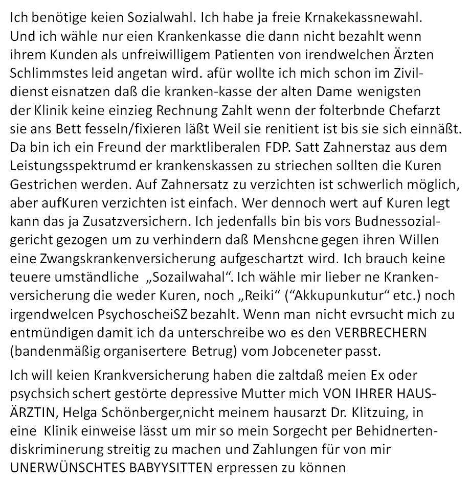 entmündigen damit ich da unterschreibe wo es den VERBRECHERN (bandenmäßig organisertere Betrug) vom Jobceneter passt.Ich will keien Krankversicherung haben die zaltdaß meien Ex oder psychsich schert gestörte depressive Mutter mich VON IHRER HAUS-ÄRZTIN, Helga Schönberger,nicht meinem hausarzt Dr. Klitzuing, in eine Klinik einweise lässt um mir so mein Sorgecht per Behidnerten-diskriminerung streitig zu machen und Zahlungen für von mir UNERWÜNSCHTES BABYYSITTEN erpressen zu können