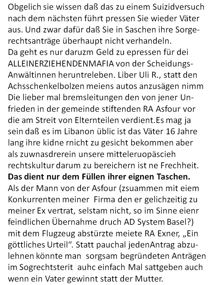 aussage ?Prinzessin Caroline? von Zajac, und den ?Prügelprinz? Michalek ich hätet sie grundlos angegriffen. Zaja hat inzwischeneuingerämt daß sie es gewesen ist die mich bedrängte/?angriff?udn der Würger hat durch das Gebrauch machen von seinem Schweigerecht als Täter (nichts sagen ist auch was sagen) aufrichterliche Nachfrage wegen des Erwürgeversuchs hin diesen seinen Erwürgeversuch quasi eingeräumt. Auf den Prozess-/Anwaltskosten von meheren tausend Euro, deretwegen ich hungere bleibe ich wohl sittzen. Genau wie als ich damals gegen Uta Riek gewonnen habe und der Vorschußbetrügende Richter allen ernstes ensthcied er könne die Prozesskosten doch nicht der Umgansgevreitelnden Mutter auferlegen, das träfe doch nur das Kid, richtig, deshalb hätte ich als Richter sattdessen