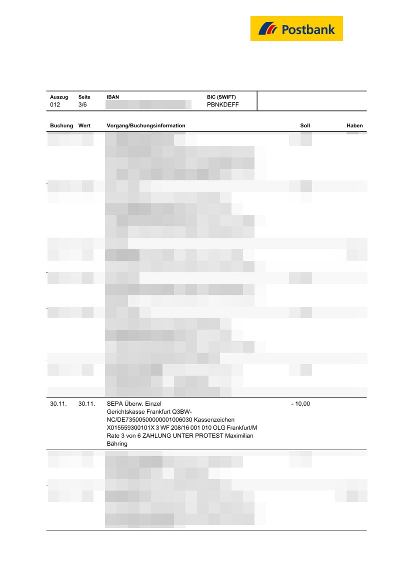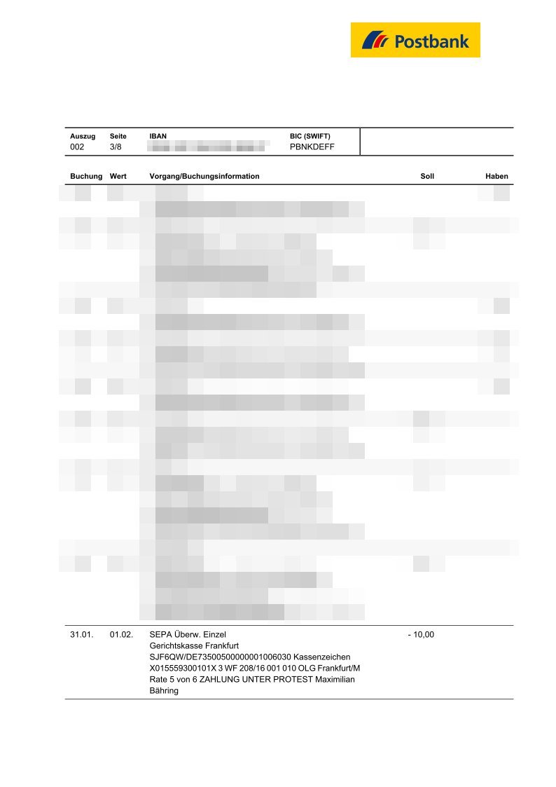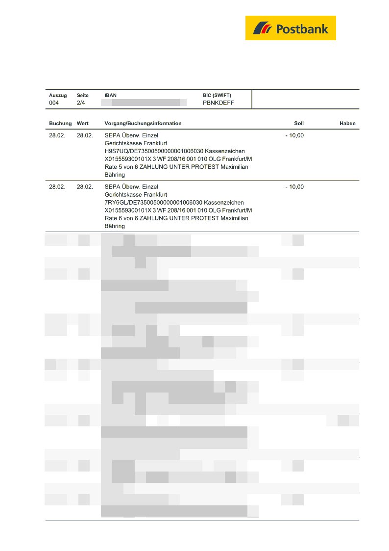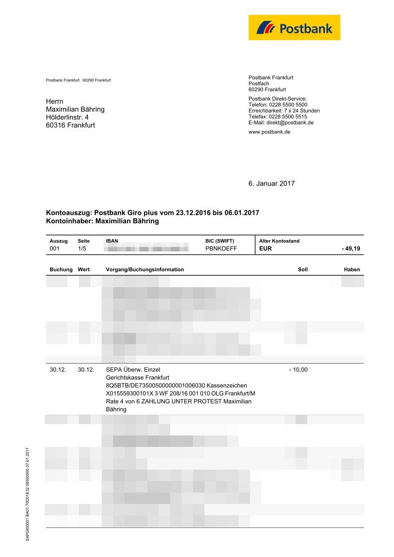 Den Restbetrag von Euro 15,64 habe ich auf ihr Kanzleikonto überwiesen. Ich hätte das Geld ja gerne an meienLEtren slebst überweiden aber mir fehlt eine akteulle Konto-nummer. Als Absender auf demBref stand auch nur Ma, so daß ich auchnicht post-alisch antworten wollte. Das versendenvon gedl auf dem