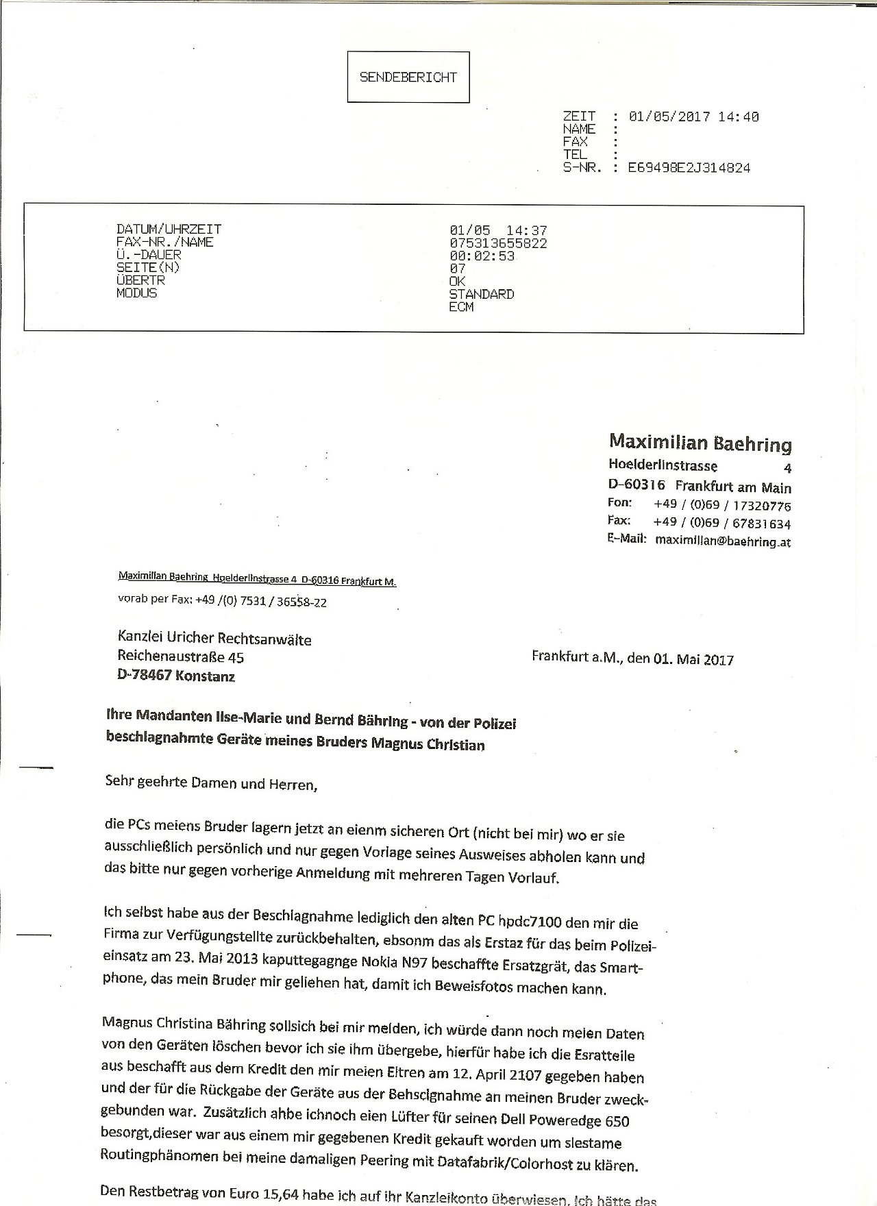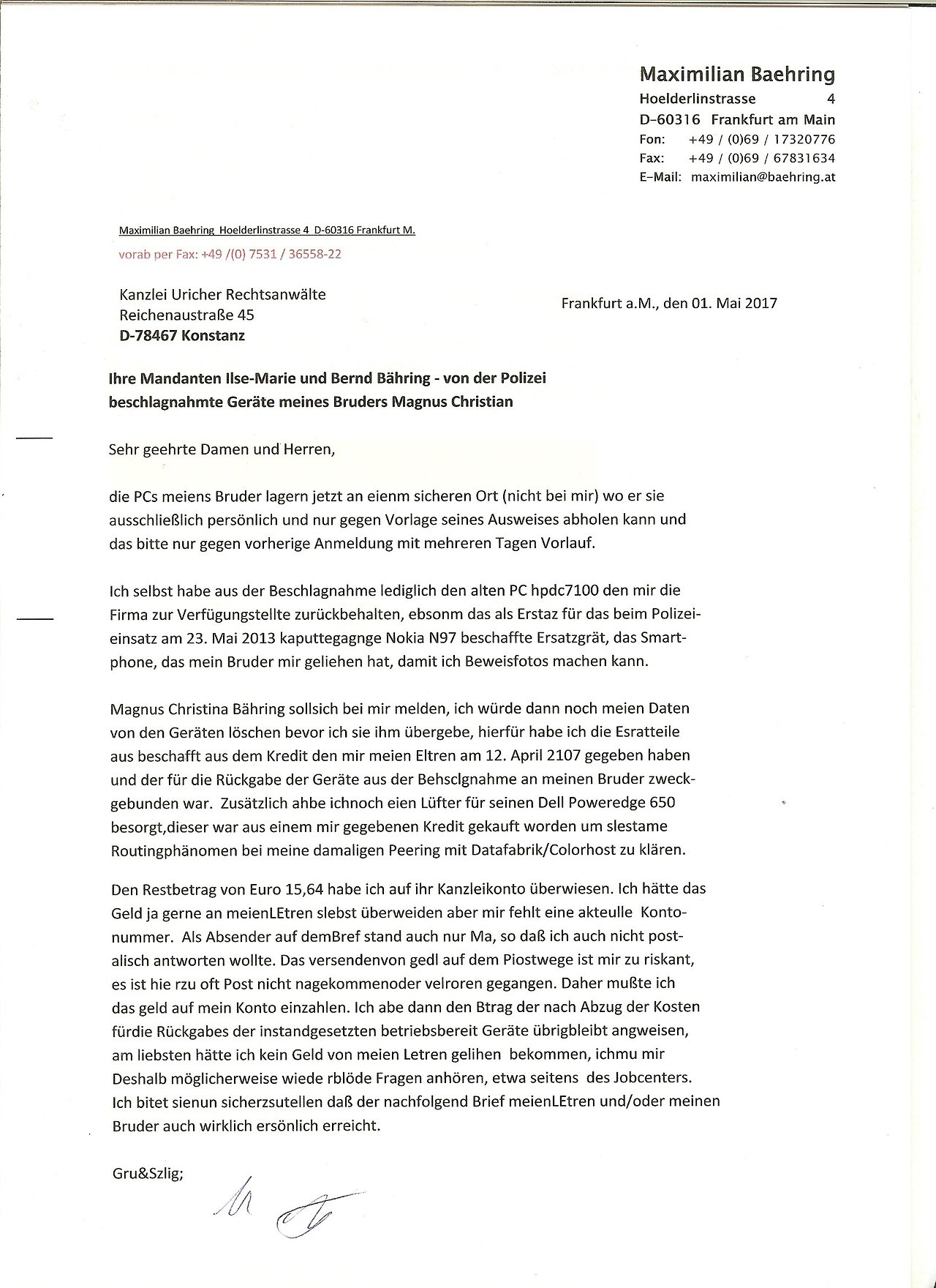 beschlagnahmte Geräte meines Bruders Magnus ChristianSehr geehrte Damen und Herren,die PCs meiens Bruder lagern jetzt an eienm sicheren Ort (nicht bei mir) wo er sie ausschließlich persönlich und nur gegen Vorlage seines Ausweises abholen kann und das bitte nur gegen vorherige Anmeldung mit mehreren Tagen Vorlauf.