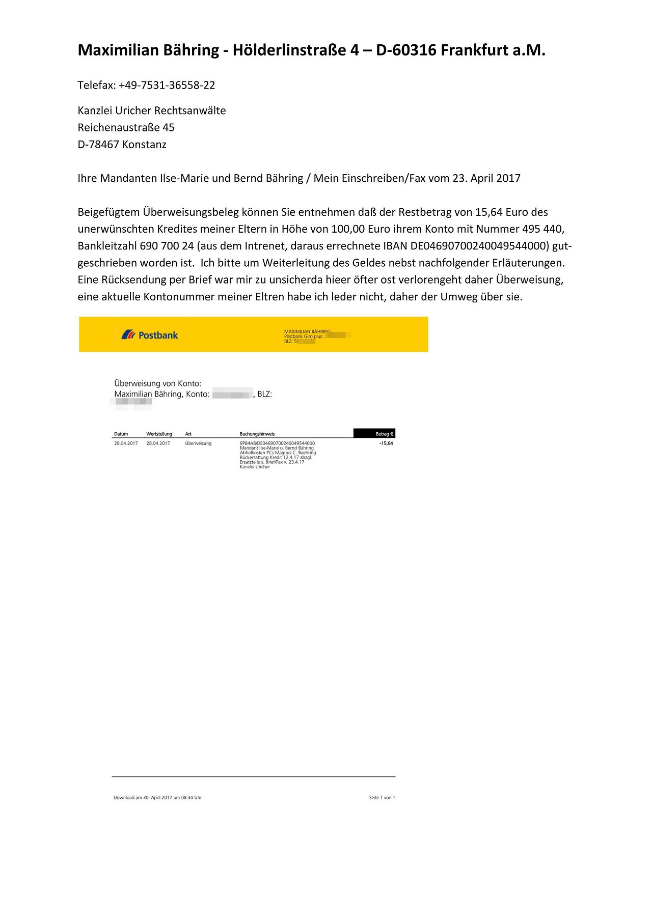 Ich habe euch jedenfalls den Restbetrag von 15,64 Euro an eure Anwälte