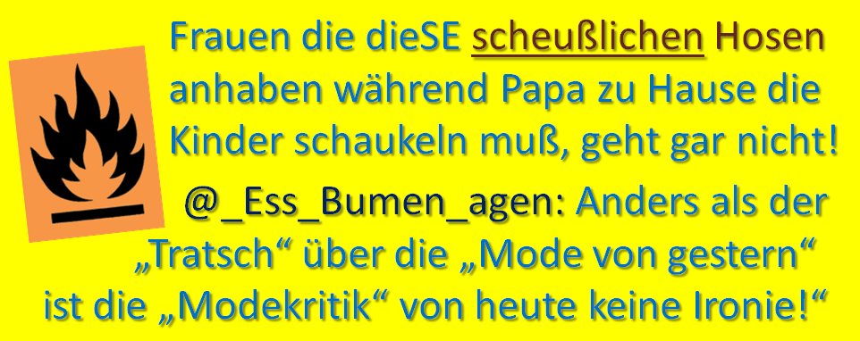 03.05.2017 04:44 Frauen die dieSE scheußlichen Hosen anhaben während Papa zu Hause die Kinder schaukeln muß, geht gar nicht! @_Ess_Bumen_agen: Anders als der?Tratsch? über die ?Mode von gestern? ist die ?Modekritik? von heute keine Ironie!? [0] "201705030444-160254191898-0.jpg" [1] "201705030444-160254191898-1.jpg" [2] "201705030444-160254191898-2.jpg" |