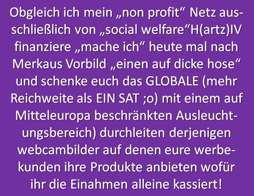 ?Mein System kennt keine Grenzen (Live)? Obgleich ich mein ?non profit? Netz aus-schließlich von ?social welfare? H(artz)IV finanziere ?mache ich? heute mal nach Merkaus Vorbild ?einen auf dicke hose? und schenke euch das GLOBALE (mehr Reichweite als EIN SAT ;o) mit einem auf Mitteleuropa beschränkten Ausleuchtungsbereich) durchleiten derjenigen webcambilder auf denen eure werbe-kunden ihre Produkte anbieten wofür ihr die Einahmen alleine kassiert!