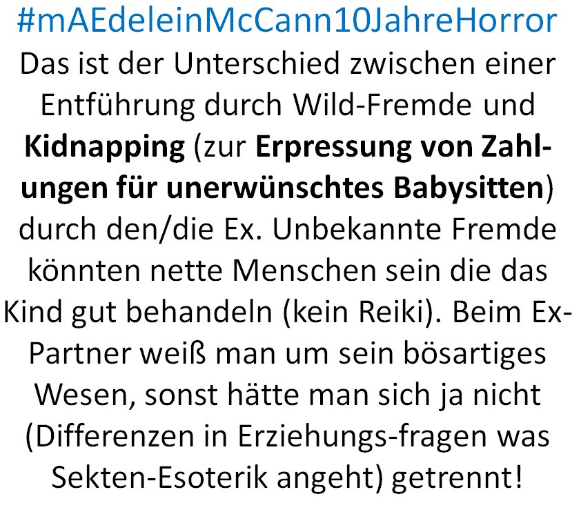03.05.2017 06:26 #mAEdeleinMcCann10JahreHorrorDas ist der Unterschied zwischen einer Entführung durch Wild-Fremde und Kidnapping (zur Erpressung von Zahl-ungen für unerwünschtes Babysitten) durch den/die Ex. Unbekannte Fremde könnten nette Menschen sein die das Kind gut behandeln (kein Reiki). Beim Ex-Partner weiß man um sein bösartiges Wesen, sonst hätte man sich ja nicht (Differenzen in Erziehungs-fragen was Sekten-Esoterik angeht) getrennt! [0] "201705030626-160256694423-0.jpg" |