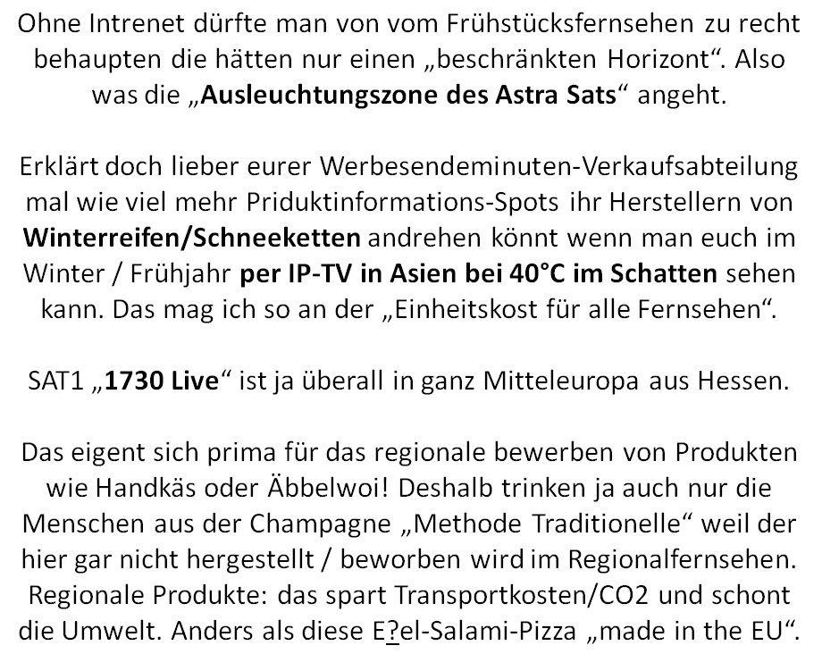 ?Wir hatten es zuerst einself!!!!? Ohne Intrenet dürfte man von vom Frühstücksfernsehen zu recht behaupten die hätten nur einen ?beschränkten Horizont?. Also was die ?Ausleuchtungszone des Astra Sats? angeht. [0] "201705030657-160272204453-0.jpg" [1] "201705030657-160272204453-1.jpg" [2] "201705030657-160272204453-2.jpg" |