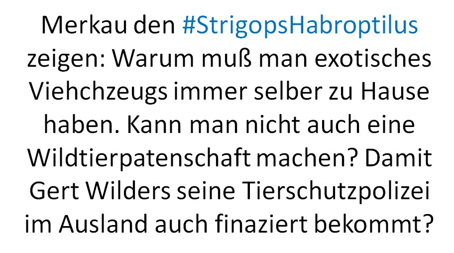 03.05.2017 07:49 Merkau den #StrigopsHabroptiluszeigen: Warum muß man exotisches Viehchzeugs immer selber zu Hause haben. Kann man nicht auch eine Wildtierpatenschaft machen? Damit Gert Wilders seine Tierschutzpolizei im Ausland auch finaziert bekommt?