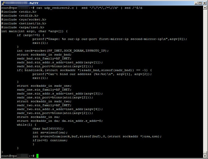 31.05.2017 08:07 Für alle die nicht nur TCP für was es RINETD gibt sondern auch UDP Traffic umleiten wollen. /* http://www.brokestream.com/udp_redirect.html Build: gcc -o udp_redirect udp_redirect.c udp_redirect.c Version 2008-11-09 Copyright (C) 2007 Ivan Tikhonov This software is provided 'as-is', without any express or implied warranty. In no event will the authors be held liable for any damages arising from the use of this software. Permission is granted to anyone to use this software for any purpose, including commercial applications, and to alter it and redistribute it freely, subject to the following restrictions: 1. The origin of this software must not be misrepresented; you must not claim that you wrote the original software. If you use this software in a product, an acknowledgment in the product documentation would be appreciated but is not required. 2. Altered source versions must be plainly marked as such, and must not be misrepresented as being the original software. 3. This notice may not be removed or altered from any source distribution. Ivan Tikhonov, kefeer@brokestream.com */ #include #include #include #include #include int main(int argc, char *argv[]) { if (argc!=5) { printf("Usage: %s our-ip our-port first-mirror-ip second-mirror-ip\n",argv[0]); exit(1); } int osck=socket(PF_INET,SOCK_DGRAM,IPPROTO_IP); struct sockaddr_in sadr_bnd; sadr_bnd.sin_family=AF_INET; sadr_bnd.sin_addr.s_addr=inet_addr(argv[1]); sadr_bnd.sin_port=htons(atoi(argv[2])); if( bind(osck,(struct sockaddr *)&sadr_bnd,sizeof(sadr_bnd)) == -1) { printf("Can't bind our address (%s:%s)\n", argv[1], argv[2]); exit(1); } struct sockaddr_in sadr_one; sadr_one.sin_family=AF_INET; sadr_one.sin_addr.s_addr=inet_addr(argv[3]); sadr_one.sin_port=htons(atoi(argv[2])); struct sockaddr_in sadr_two; sadr_two.sin_family=AF_INET; sadr_two.sin_addr.s_addr=inet_addr(argv[4]); sadr_two.sin_port=htons(atoi(argv[2])); struct sockaddr_in sa; struct sockaddr_in da; da.sin_addr.s_addr=0; while(1) { char buf[65535]; int sn=sizeof(sa); int n=recvfrom(osck,buf,sizeof(buf),0,(struct sockaddr *)&sa,&sn); if(n<=0) continue; //printf("data from %s:%u\n", inet_ntoa(sa.sin_addr), ntohs(sa.sin_port)); /* inet_ntoa needs #include [0] "201705310807-161288706258-0.jpg" [1] "201705310807-161288706258-1.jpg" |
