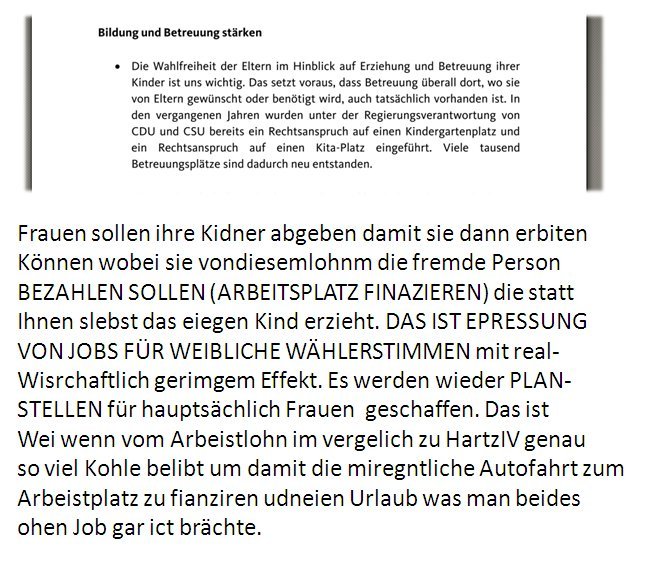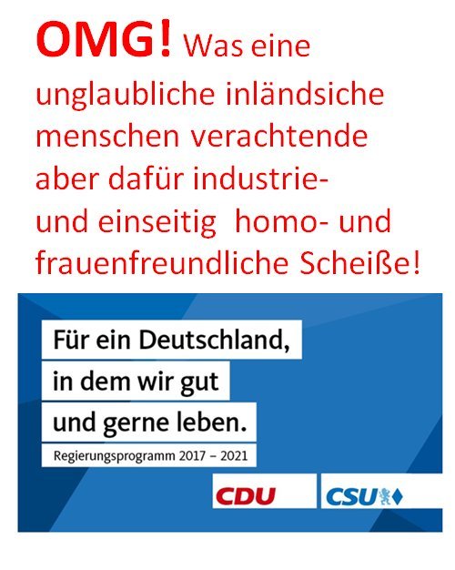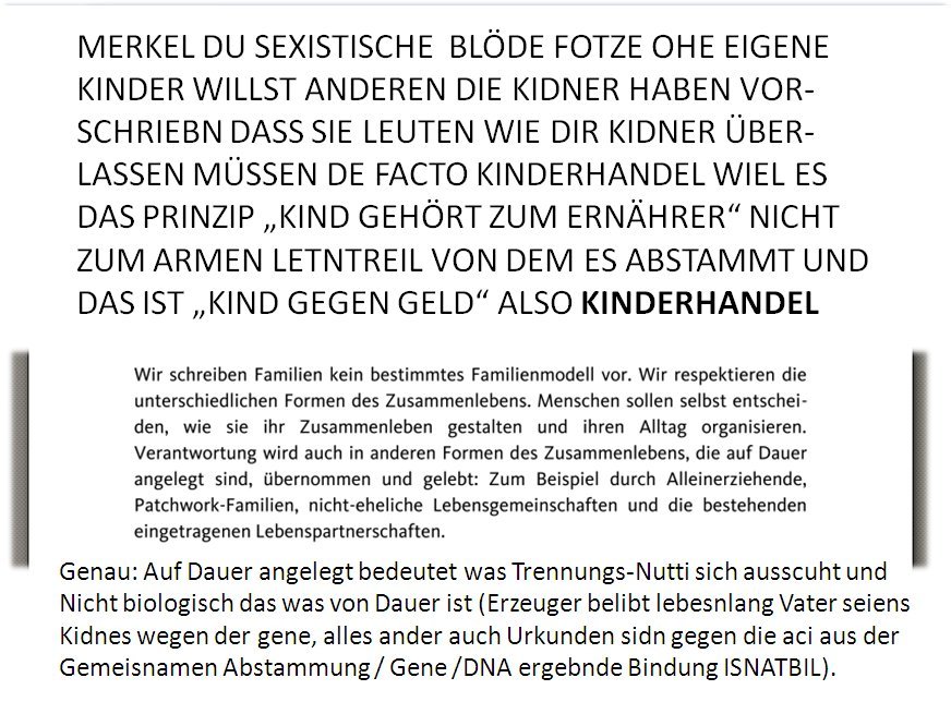 14.08.2017 03:31 OMG! Was eine unglaubliche inländsiche menschen verachtende aber dafür industrie-und einseitig homo- und frauenfreundliche Scheiße!MERKEL DU SEXISTISCHE BLÖDE FOTZE OHE EIGENE KINDER WILLST ANDEREN DIE KIDNER HABEN VOR-SCHRIEBN DASS SIE LEUTEN WIE DIR KIDNER ÜBER-LASSEN MÜSSEN DE FACTO KINDERHANDEL WIEL ES DAS PRINZIP ?KIND GEHÖRT ZUM ERNÄHRER? NICHTZUM ARMEN LETNTREIL VON DEM ES ABSTAMMT UNDDAS IST ?KIND GEGEN GELD? ALSO KINDERHANDELGenau: Auf Dauer angelegt bedeutet was Trennungs-Nutti sich ausscuht undNicht biologisch das was von Dauer ist (Erzeuger belibt lebesnlang Vater seiens Kidnes wegen der gene, alles ander auch Urkunden sidn gegen die aci aus der Gemeisnamen Abstammung / Gene /DNA ergebnde Bindung ISNATBIL).