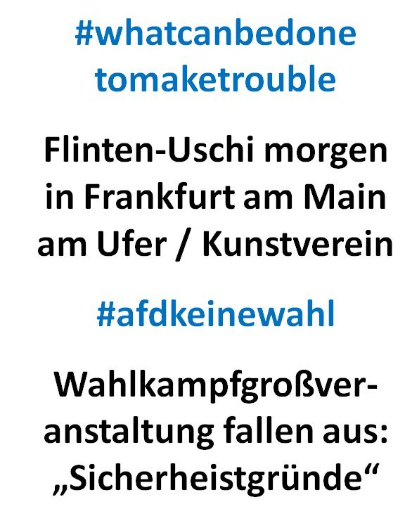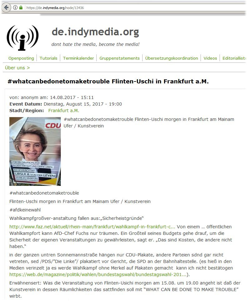 14.08.2017 12:32 #whatcanbedonetomaketrouble http://www.faz.net/aktuell/rhein-main/frankfurt/wahlkampf-in-frankfurt-cdu-muss-ohne-angela-merkel-auskommen-15123833.html Von einem ? öffentlichen Wahlkampfort kann AfD-Chef Fuchs nur