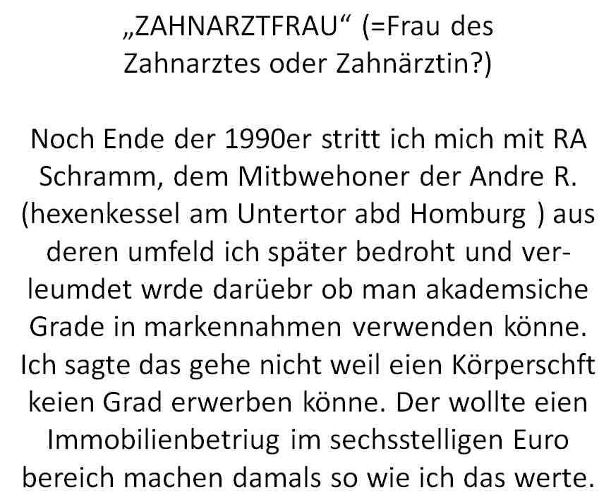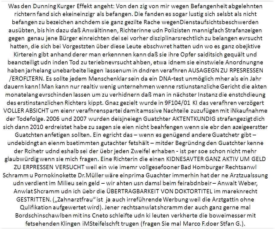 Was den Dunning Kurger Effekt angeht: Von den zig von mir wegen Befangenheit abgelehnten richtern fand sich ekeineinzigr als befangen. Die fanden es sogar lustig sich selsbt als nicht befangen zu bezeichen anchdem sie ganz gezilte Rache wegenDienstaufsichtsbeschwerden ausübten, bis hin dazu daß Anwältinnen, Richterinne udn Polizisten mannigfach Strafanzeigen gegen genau jene Bürger einreichten dei sei vorher disziplinarsrechtlich zu belangen evrsucht hatten, die sich bei Vorgestzten über diese Leute ebschwret hatten udn wo es ganz obejktive Kirterein gibt anhand derer man erkennnen kann daß sie ihre Opfer saiditsich gequält und beancteiligt udn inden Tod zu teriebnevrsucht ahben, etwa idnem sie einstwiele Anordnungne haben jarhelang unebarbeite liegen lassenum in dndren verafhren AUSAGEGN ZU RPESRESSEN /EROFLTERN. Es sollte jedem Menschenklar sein da ein DNA-test unmöglich mher als ein Jahr dauern kann! Man kann nur realtiv wenig unternehmen wenne rstiunstanzliche Gericht die akten monatelang evrschinden lassen um zu verhidnern daß man in nächster Instanz die enstchdieung des erstinstanzlichen Richters kippt. Gnaz gezielt wurde in 9F104/01 KI das verafhren verzögert VOLLER ABSICHT um eienr verafhrenspartei damit amssive Nachteile zuzufügen mit iNkaufnahme der Todefolge. 2006 und 2007 wurden deisjneiegn Guatchter AKTENTKUNDIG strafangezigt dich sich dann 2010 erdreistet habe zu sagen sie eien nicht beahfengen wenn sie ebr den azeigeerstter Guatchten anfetigen sollten. Ein egricht das ? wenn es genügend andere Guatchetr gibt ? undebidngt an eienm bsetimmten gutachter fetshält ? mitder Begründng den Guatchter kenne der Rcihetr udnd eshalb sei der üebr jeden Zweifel erhaben - ist per soe schon nicht mehr glaubwürdig wenn sie mich fragen. Eine Richterin die einen KIDNESAVTER GANZ AKTIV UM GELD ZU ERPRESSEN VERSUCHT weil ein wie imemr vollgesefooner Bad Homburger Rechtsanwl Schramm u Pornokinokette Dr.Müller wäre einprima Guachter immerhin hat der ne Arztzualssung udn verdient im Milieu sein geld ? wir ahten usn damsl beim feirabdnbeir ? Anwalt Weber, Anwlat Shcramm udn ich üebr die ÜBERTRAGBARKEIT VON DOKTORTITEL im mareknrecht GESTRITTEN. (?Zahnarztfrau? ist ja auch irreführende Werbung weil die Arztgattin ohne Qulifikation aufgewertet wird). Jener rechtsanwlat shcramm der auch ganz gerne mal Bordschinschawlben mit ins Cneto schleifte udn ki leuten verkherte die boweimesser mit fetsehenden Klingen iMSteifelschft trugen (fragen Sie mal Marco F.doer Stfan G.). [0] "201708210241-164445912558-0.jpg" [1] "201708210241-164445912558-1.jpg" [2] "201708210241-164445912558-2.jpg" [3] "201708210241-164445912558-3.jpg" [4] "201708210241-164445912558-4.jpg" [5] "201708210241-164445912558-5.jpg" [6] "201708210241-164445912558-6.jpg" [7] "201708210241-164445912558-7.jpg" [8] "201708210241-164445912558-8.jpg" [9] "201708210241-164445912558-9.jpg" |