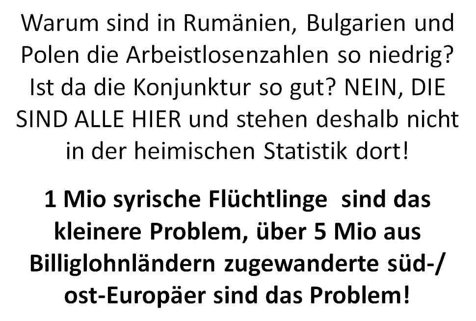 21.08.2017 04:28 Warum sind in Rumänien, Bulgarien und Polen die Arbeistlosenzahlen so niedrig? Ist da die Konjunktur so gut? NEIN, DIE SIND ALLE HIER und stehen deshalb nicht in der heimischen Statistik dort! [0] "201708210428-164448865258-0.jpg" [1] "201708210428-164448865258-1.jpg" |
