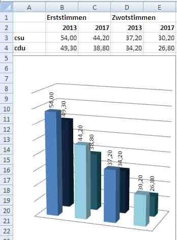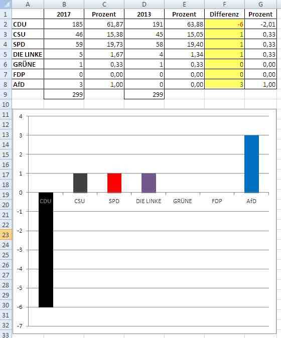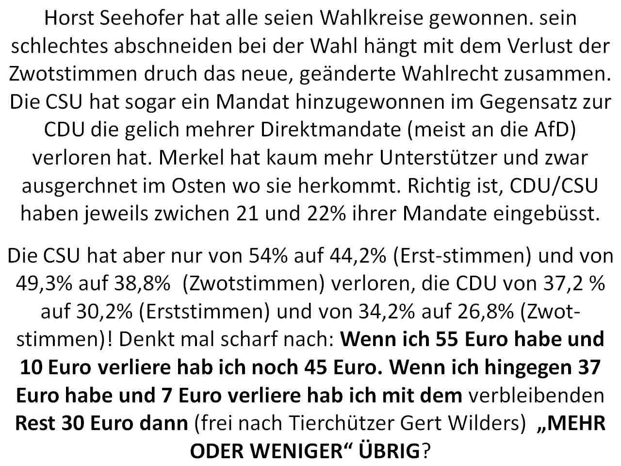 27.09.2017 11:31 Horst Seehofer hat alle seien Wahlkreise gewonnen. sein schlechtes abschneiden bei der Wahl hängt mit dem Verlust der Zwotstimmen druch das neue, geänderte Wahlrecht zusammen. Die CSU hat sogar ein Mandat hinzugewonnen im Gegensatz zur CDU die gelich mehrer Direktmandate (meist an die AfD) verloren hat. Merkel hat kaum mehr Unterstützer und zwar ausgerchnet im Osten wo sie herkommt. Richtig ist, CDU/CSU haben jeweils zwichen 21 und 22% ihrer Mandate eingebüsst. [0] "201709271131-165792759958-0.jpg" [1] "201709271131-165792759958-1.jpg" |