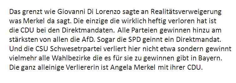 27.09.2017 07:16 Das grenzt wie Giovanni Di Lorenzo sagte an Realitätsverweigerungwas Merkel da sagt. Die einzige die wirklich heftig verloren hat ist die CDU bei den Direktmandaten. Alle Parteien gewinnen hinzu am stärksten von allen die AfD. Sogar die SPD geinnt ein Direktmandat.Und die CSU Schwesetrpartei verliert hier nicht etwa sondern gewinntvielmehr alle Wahlbezirke die es für sie zu gewinnen gibt in Bayern.Die ganz alleinige Verliererin ist Angela Merkel mit ihrer CDU. [0] "201709270716-165803944488-0.jpg" [1] "201709270716-165803944488-1.jpg" |