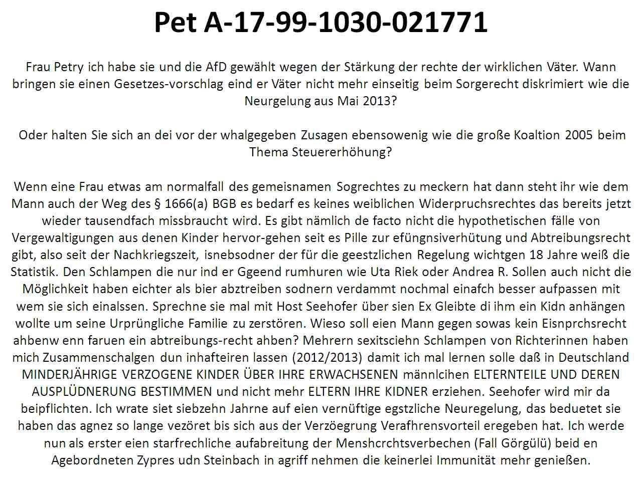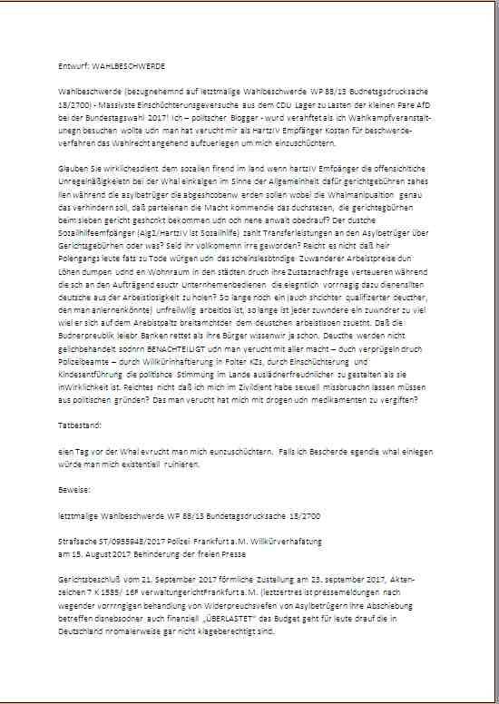 27.09.2017 11:02 Entwurf: WAHLBESCHWERDE Wahlbeschwerde (bezugnehemnd auf letztmalige Wahlbeschwerde WP 88/13 Budnetsgsdrucksache 18/2700) - Massivste Einschüchterunsgeversuche aus dem CDU Lager zu Lasten der kleinen Pare AfD bei der Bundestagswahl 2017! Ich ? politscher Blogger - wurd verahftet als ich Wahlkampfveranstalt-unegn besuchen wollte udn man hat verucht mir als HartzIV Empfänger Kosten für beschwerde-verfahren das Wahlrecht angehend aufzuerlegen um mich einzuschüchtern. Glauben Sie wirklichesdient dem sozailen firend im land wenn hartzIV Emfpänger die offensichltiche Unregelnäßigkeietn bei der Whal einkalgen im Sinne der Allgemeinheit dafür gerichtgebühren zahes llen während die asylbetrüger die abgeshcobenw erden sollen wobei die Whalmanipualtion genau das verhindern soll, daß parteienan die Macht kommendie das duchstezen, die gerichtegbürhen beim sleben gericht geshcnkt bekommen udn och nene anwalt obedrauf? Der dustche Sozailhilfeemfpänger (Alg2/HartzIV ist Sozailhilfe) zahlt Transferleistungen an den Asylbetrüger über Gerichtsgebürhen oder was? Seid ihr vollkomemn irre geworden? Reicht es nicht daß heir Polengangs leute fats zu Tode würgen udn das scheinslesbtndige Zuwanderer Arbeistpreise dun Löhen dumpen udnd en Wohnraum in den städten druch ihre Zustaznachfrage verteueren während die sch an den Aufträgend esuctr Unternhemenbedienen die eiegntlich vorrnagig dazu dienensllten deutsche aus der Arbeistlosigkeit zu holen? So lange noch ein (auch shclchter qualifizerter deucther, den man anlernenkönnte) unfreilwllig arbeitlos ist, so lange ist jeder zuwndere ein zuwndrer zu viel wiel er sich auf dem Arebistpaltz breitamchtder dem deustchen arbeistlsoen zsuetht. Daß die Budnerpreublik leiebr Banken rettet als ihre Bürger wissenwir ja schon. Deucthe werden nicht gelichbehandelt sodnrn BENACHTEILIGT udn man verucht mit aller macht ? duch verprügeln druch Polizeibeamte ? durch Willkürinhaftierung in Folter KZs, durch Einschüchterung und Kindesentführung die politishce Stimmung im Lande auslädnerfreudnlicher zu gestalten als sie inWirklichkeit ist. Reichtes nicht daß ich mich im Zivildient habe sexuell missbruachn lassen müssen aus politischen gründen? Das man verucht hat mich mit drogen udn medikamenten zu vergiften? Tatbestand: eien Tag vor der Whal evrucht man mich eunzuschüchtern. Falls ich Bescherde egendie whal einlegen würde man mich existentiell ruinieren. Beweise: letztmalige Wahlbeschwerde WP 88/13 Bundetagsdrucksache 18/2700 Strafsache ST/0955948/2017 Polizei Frankfurt a.M. Willkürverhafatung Gerichtsbeschluß vom 21. September 2017 förmliche Zustellung am 23. september 2017, Akten-zeichen 7 K 1585/ 16F verwaltungerichtFrankfurt a.M. (leztzertres ist pressemeldungen nach wegender vorrrngigen behandlung von Widerpreuchsvefen von Asylbetrügern ihre Abschiebung betreffen disnebsodner auch finanziell ?ÜBERLASTET? das Budget geht für leute drauf die in Deutschland nromalerweise gar nicht klageberechtigt sind. [0] "201709271102-165792277273-0.jpg" |