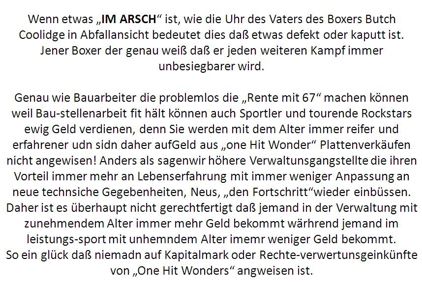 Wenn etwas ?IM ARSCH? ist, wie die Uhr des Vaters des Boxers Butch Coolidge in Abfallansicht bedeutet dies daß etwas defekt oder kaputt ist. Jener Boxer der genau weiß daß er jeden weiteren Kampf immer unbesiegbarer wird.