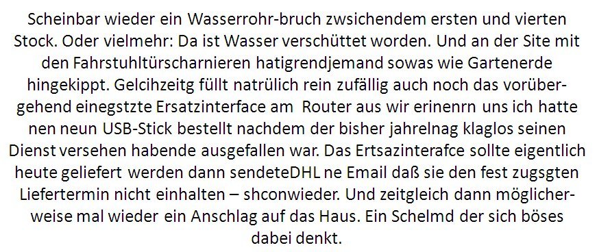 Scheinbar wieder ein Wasserrohr-bruch zwsichendem ersten und vierten Stock. Oder vielmehr: Da ist Wasser verschüttet worden. Und an der Site mit den Fahrstuhltürscharnieren hatigrendjemand sowas wie Gartenerde hingekippt. Gelcihzeitg füllt natrülich rein zufällig auch noch das vorüber-gehend einegstzte Ersatzinterface am Router aus wir erinenrn uns ich hatte nen neun USB-Stick bestellt nachdem der bisher jahrelnag klaglos seinen Dienst versehen habende ausgefallen war. Das Ertsazinterafce sollte eigentlich heute geliefert werden dann sendeteDHL ne Email daß sie den fest zugsgten Liefertermin nicht einhalten ? shconwieder. Und zeitgleich dann möglicher-weise mal wieder ein Anschlag auf das Haus. Ein Schelmd der sich böses dabei denkt.