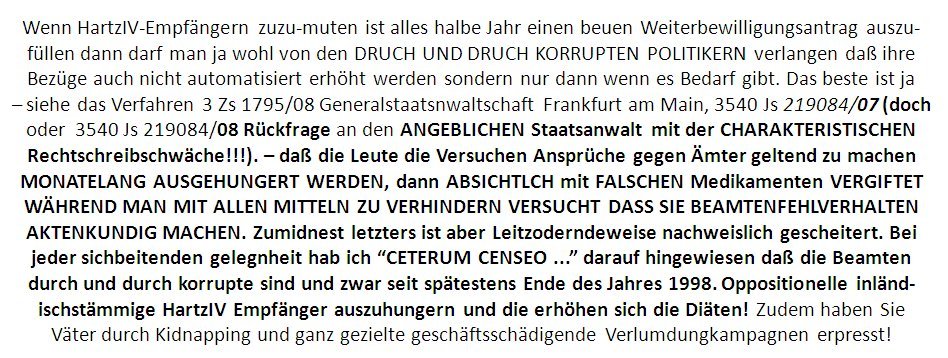 Wenn HartzIV-Empfängern zuzu-muten ist alles halbe Jahr einen beuen Weiterbewilligungsantrag auszu-füllen dann darf man ja wohl von den DRUCH UND DRUCH KORRUPTEN POLITIKERN verlangen daß ihre Bezüge auch nicht automatisiert erhöht werden sondern nur dann wenn es Bedarf gibt. Das beste ist ja ? siehe das Verfahren 3 Zs 1795/08 Generalstaatsnwaltschaft Frankfurt am Main, 3540 Js 219084/07 (doch oder 3540 Js 219084/08 Rückfrage an den ANGEBLICHEN Staatsanwalt mit der CHARAKTERISTISCHEN Rechtschreibschwäche!!!). ? daß die Leute die Versuchen Ansprüche gegen Ämter geltend zu machen MONATELANG AUSGEHUNGERT WERDEN, dann ABSICHTLCH mit FALSCHEN Medikamenten VERGIFTETWÄHREND MAN MIT ALLEN MITTELN ZU VERHINDERN VERSUCHT DASS SIE BEAMTENFEHLVERHALTEN AKTENKUNDIG MACHEN. Zumidnest letzters ist aber Leitzoderndeweise nachweislich gescheitert. Bei jeder sichbeitenden gelegnheit hab ich ?CETERUM CENSEO ?? darauf hingewiesen daß die Beamten durch und durch korrupte sind und zwar seit spätestens Ende des Jahres 1998. Oppositionelle inländ-ischstämmige HartzIV Empfänger auszuhungern und die erhöhen sich die Diäten! Zudem haben Sie Väter durch Kidnapping und ganz gezielte geschäftsschädigende Verlumdungkampagnen erpresst!