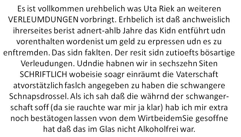 Es ist vollkommen urehbelich was Uta Riek an weiteren VERLEUMDUNGEN vorbringt. Erhbelich ist daß anchweislich ihrerseites berist adnert-ahlb Jahre das Kidn entführt udn vorenthalten wordenist um geld zu erpressen udn es zu enftremden. Das sidn faklten. Der resit sidn zutioefts bösartige Verleudungen. Udndie habnen wir in sechszehn Siten SCHRIFTLICH wobeisie soagr einräumt die Vaterschaft atvorstätzlich faslch angegeben zu haben die schwangere Schnapsdrossel. Als ich sah daß die währnd der schwanger-schaft soff (da sie rauchte war mir ja klar) hab ich mir extra noch bestätogen lassen vvon dem WirtbeidemSie gesoffne hat daß das im Glas nicht Alkoholfrei war.